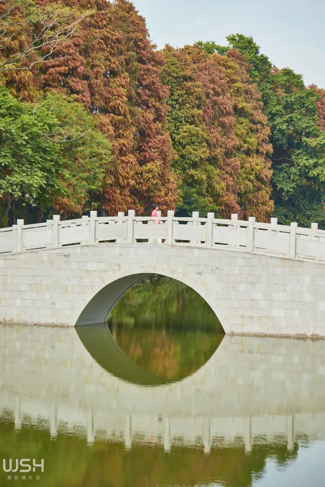 傍晚时分,落日的余晖洒在水面上,波光粼粼,水天一色,晚风拂面,带着榕江的湿润气息,格外舒适。湖边的落羽杉在秋冬季节会变成热烈的红色,与湖水、亭台相映,美不胜收,也是拍照出片的绝佳点位。