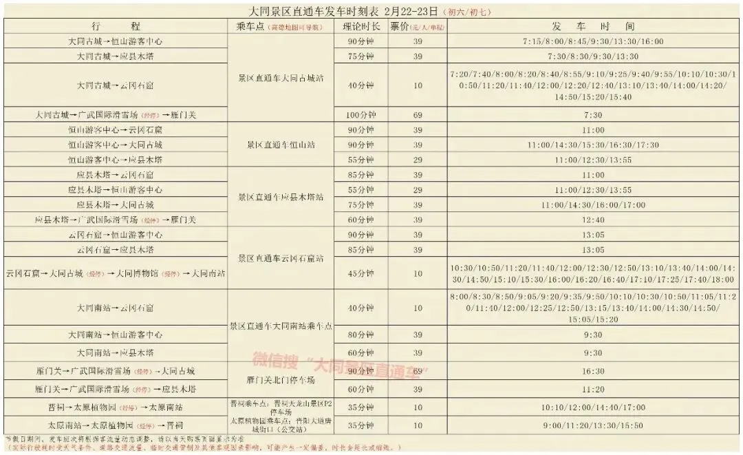 春节期间,大同景区直通车调整发车班次后进一步强化运输保障,提升服务效能。正月初一至初七,发车班次会根据客流量灵活调整,最新时刻表可在“晋游宝景区直通车”微信小程序实时查询。