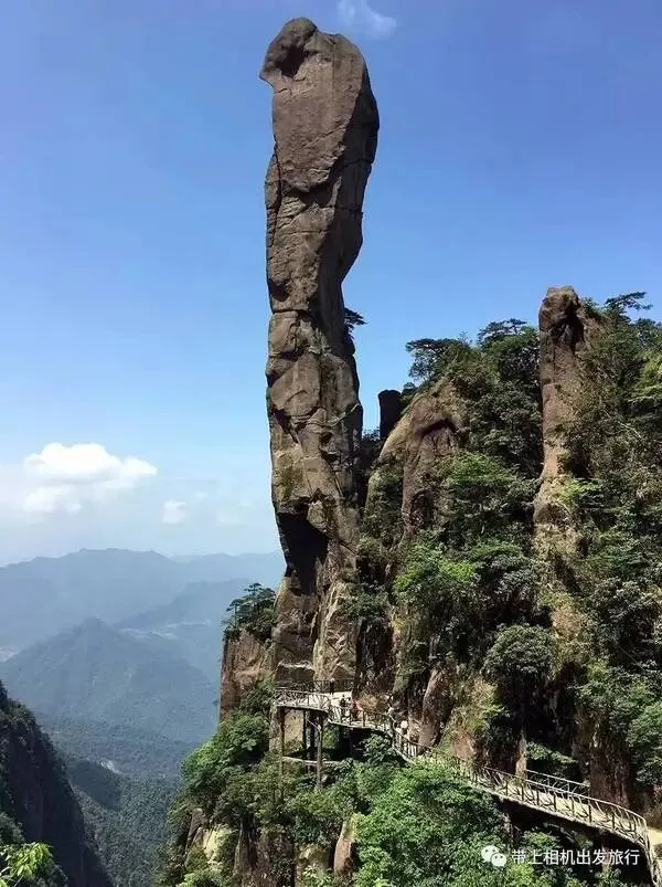 地质与主峰:世界罕见环状花岗岩峰林,72峰36瀑,主峰天梯峰1496米,远观呈睡美人山体,山脊称中华龙脊;道教天下第三十三福地