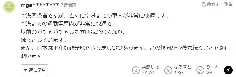 我是机场相关工作人员,感觉尤其是前往机场的途中非常舒适。通勤去机场的电车内也十分安静、舒适,以往那种嘈杂、混乱的氛围已经消失,让我感到松了一口气。此外,日本正在逐步找回作为十分安静、有序的旅游目的地的形象。我由衷地希望,这样的趋势今后也能持续下去。