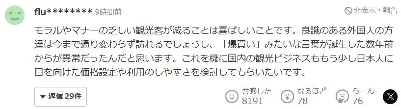 素质差和礼仪欠缺的游客减少,是一件令人欣慰的事情。有素质的外国游客,今后也会一如既往地来访。我认为,从几年前诞生了“爆买”这种说法开始,本身就是一种不正常的状态。也希望借此机会,(日本)国内的旅游业能够更多地把目光转向日本人本身,在价格设定和使用、消费的便利性方面,做出更贴近本国民众的调整与改善。