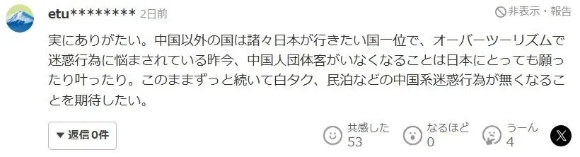确实令人感到庆幸……日本一直是各国游客最想前往的目的地第一名。近来由于过度旅游等带来麻烦的行为频发,给日本带来了不少困扰。在这样的情况下,中国游客团体减少,对日本来说也可谓正中下怀、求之不得。希望这种状况能够一直持续下去,也期待白牌出租车(非法运营出租车)、民宿等各种扰民行为能够随之消失。