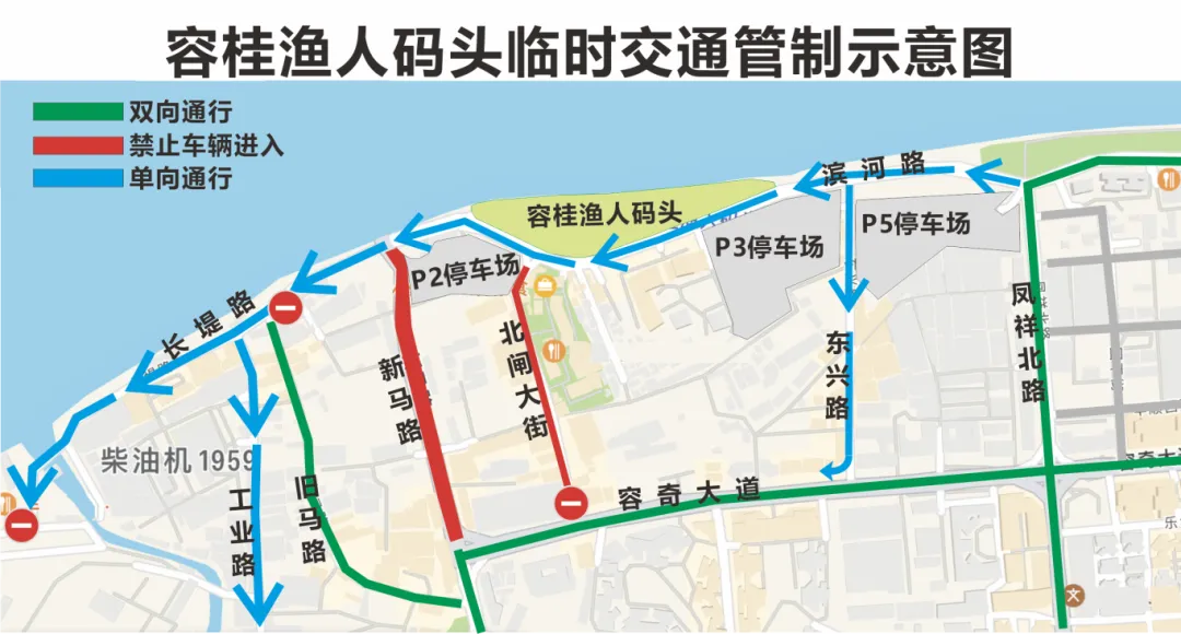 1.由于新马路封闭施工,途经渔人码头的车辆沿滨河路自东往西行驶(即凤祥路口驶入,从工业路、工农路、永新路驶出)。