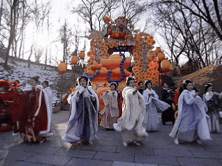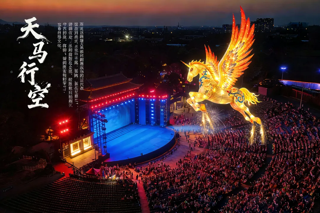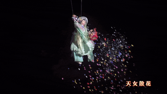 “飞马踏春” 、更有威亚加持的天女散花表演,狐仙造型的演员凌空飞舞、挥洒花瓣,中式美学与现代科技的融合,尽显东方哲学韵味。