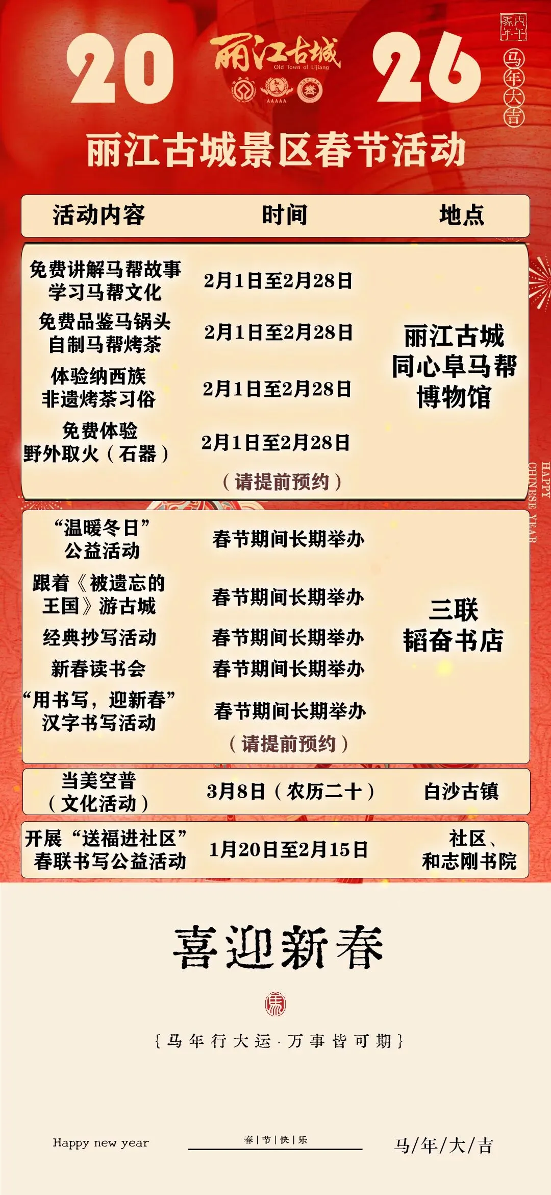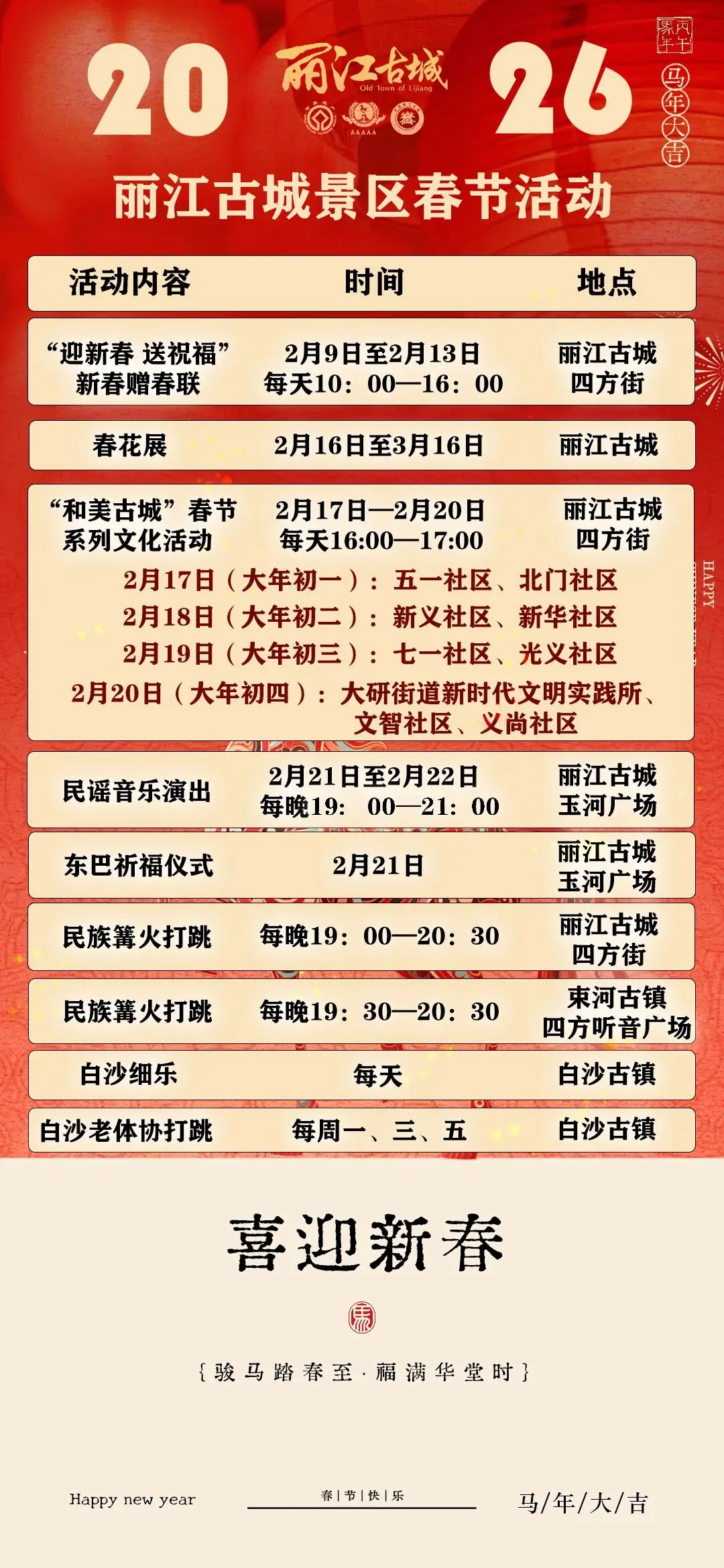 在游览过程中,如需了解景区各项民俗文化活动预告信息可关注查询微信公众号“丽江古城旅游服务”“丽江古城景区”,以及微博、抖音、小红书平台丽江古城官方账号。如有需求,可到游客服务中心、点、亭,或就近寻求景区工作人员和志愿者的帮助,或拨打咨询服务电话:0888-5111118。