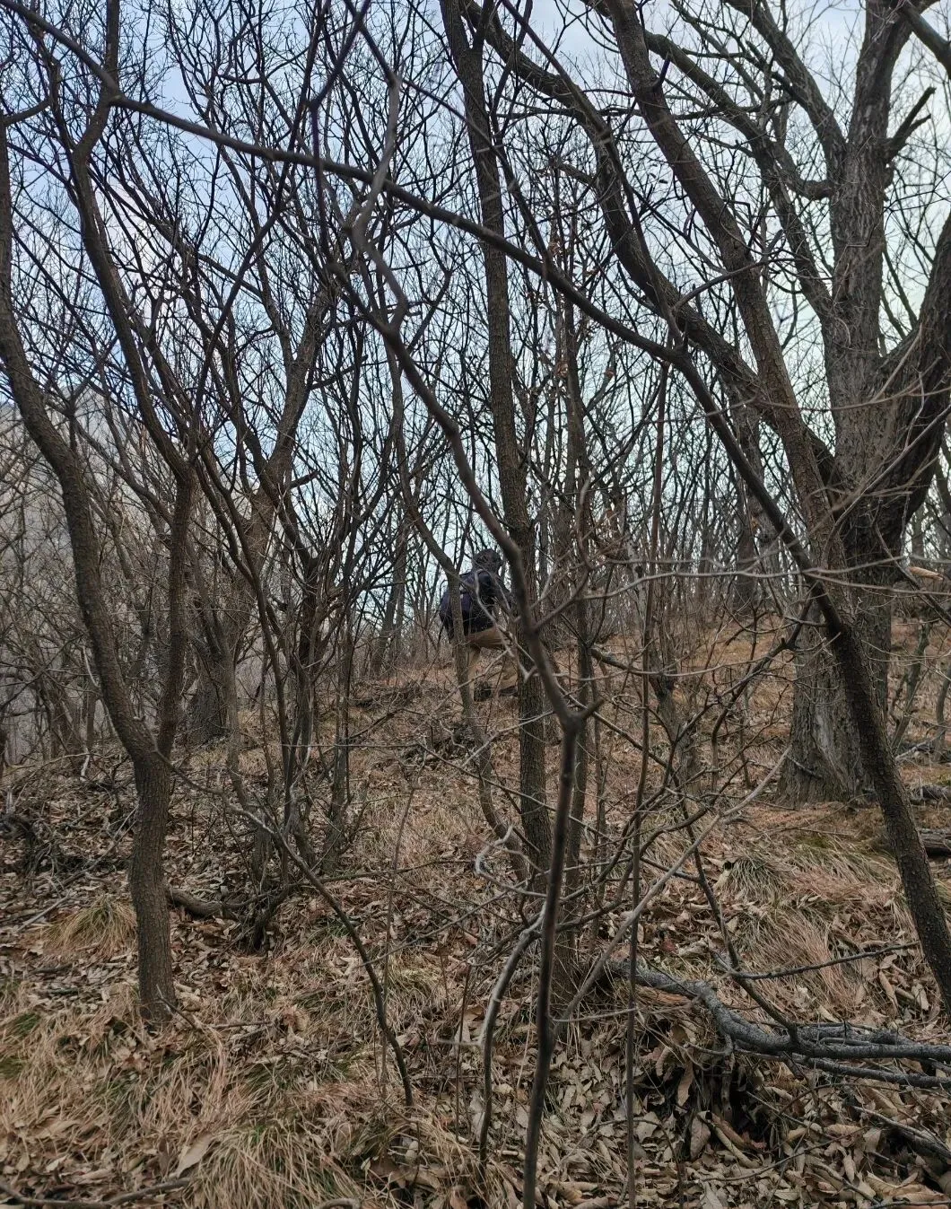 路迹确实不明显,主要是平时走得人少,落叶将路给盖住了,几乎看不出痕迹来。我们只管摸索着往上走,好在距离不长,也不算特别陡峭,半小时后就登上了公路。