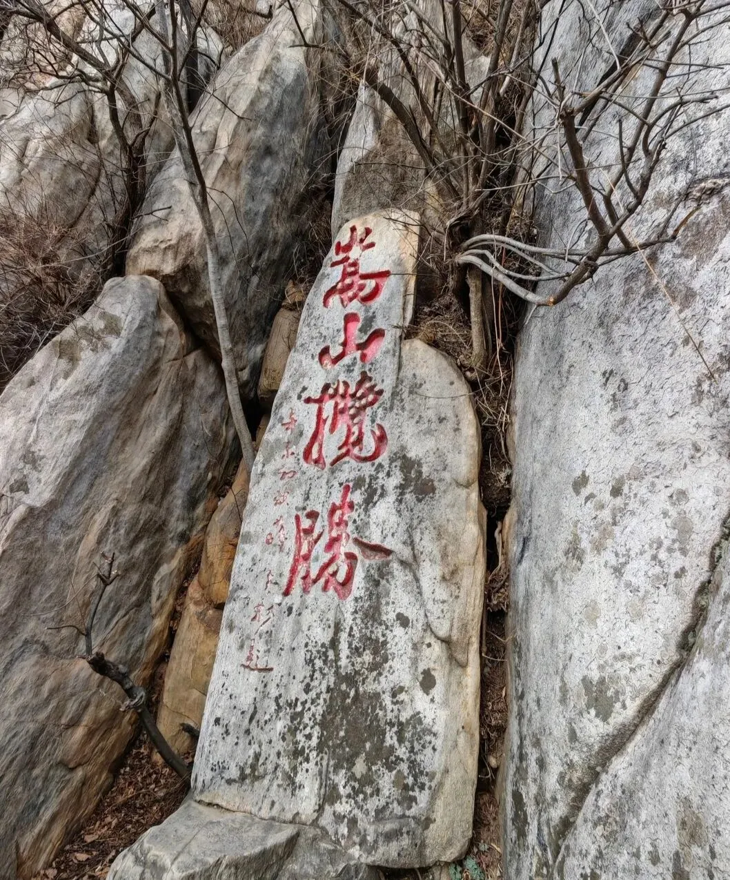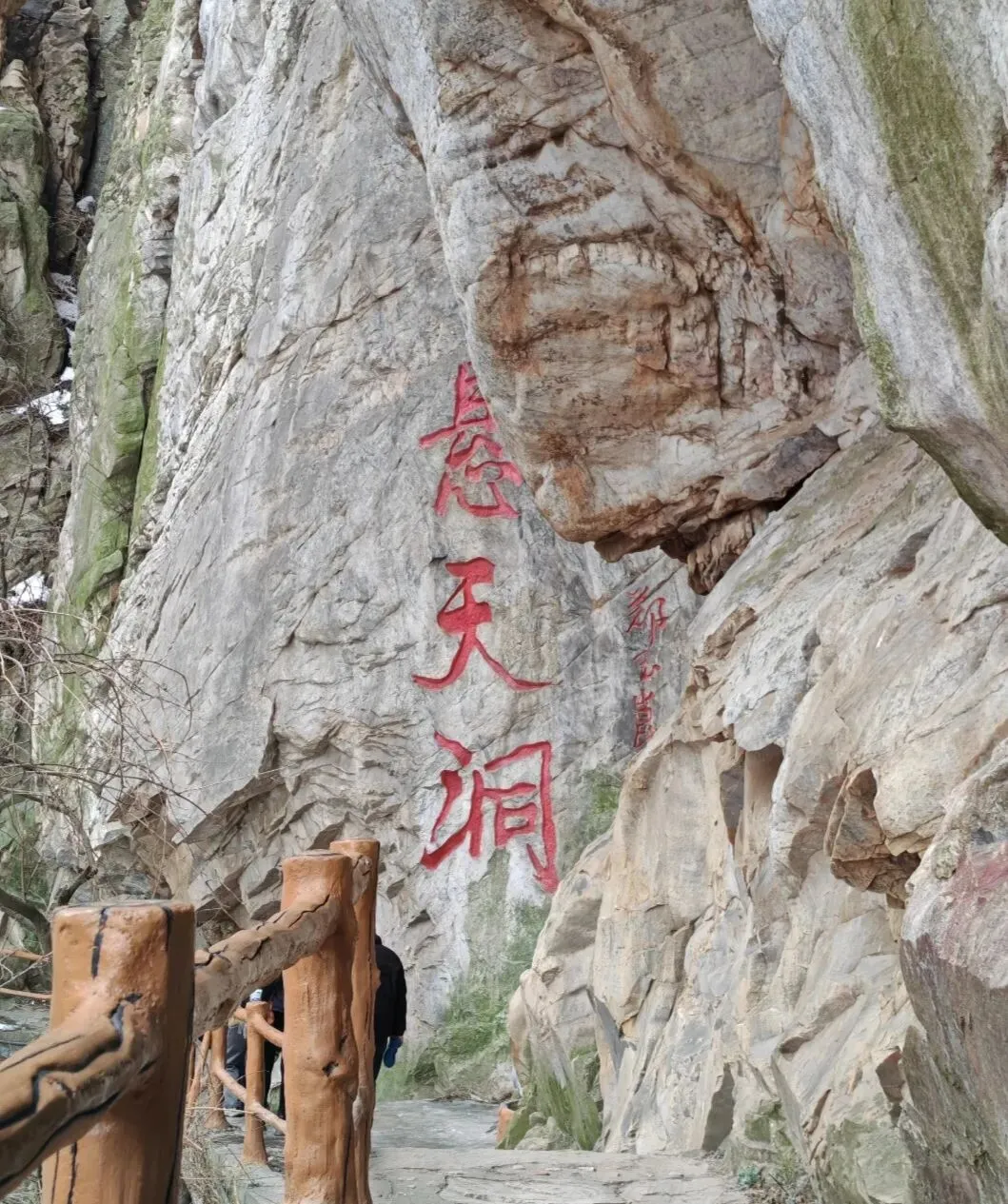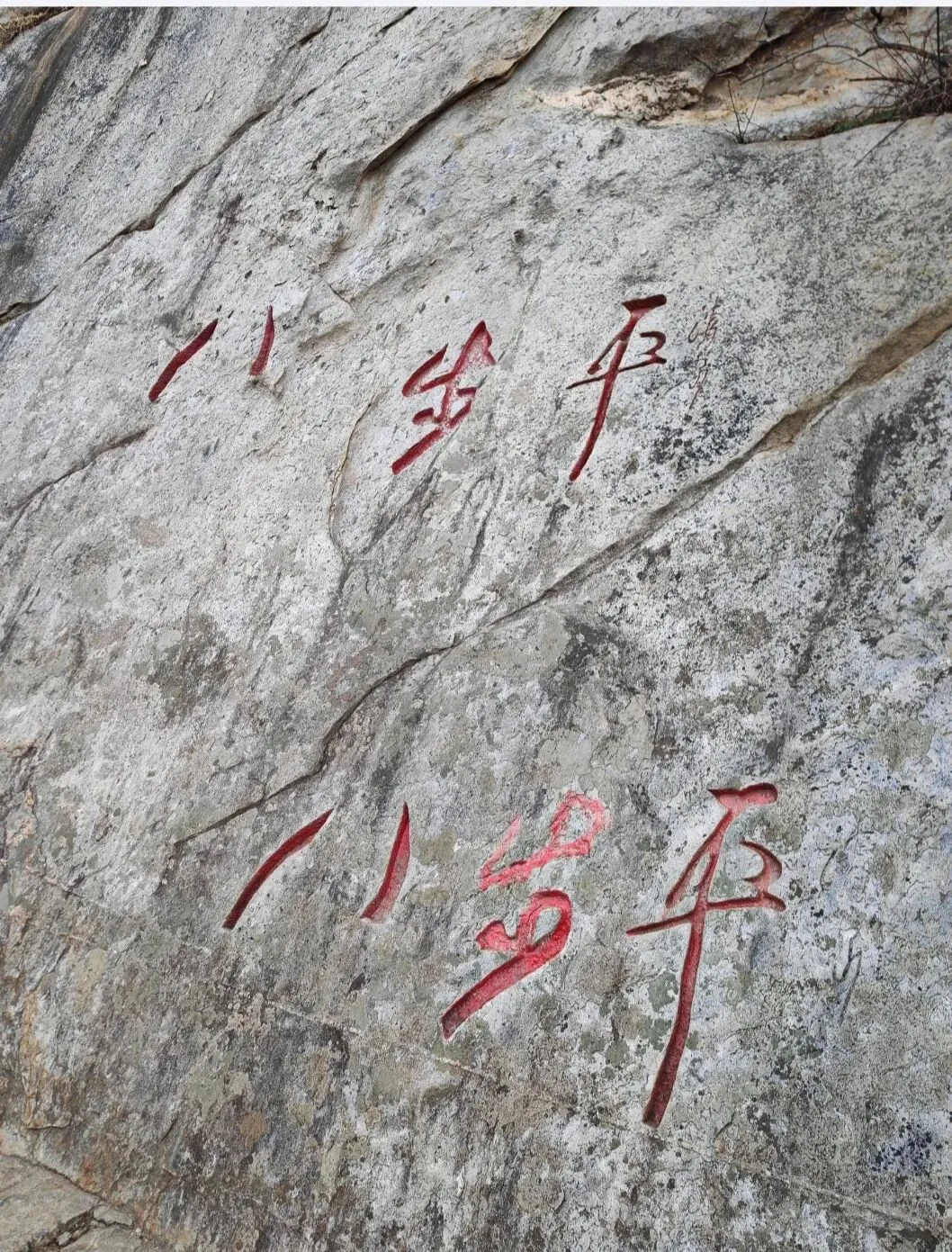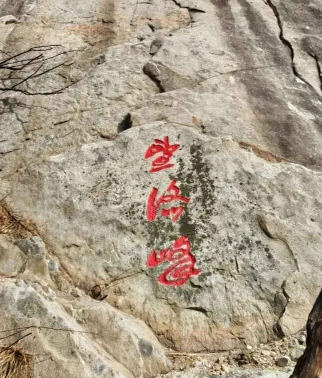 我们翻过桥头栏杆,小心翼翼地踩着沟边碎石往上走,来到刻字石前打卡盖印。