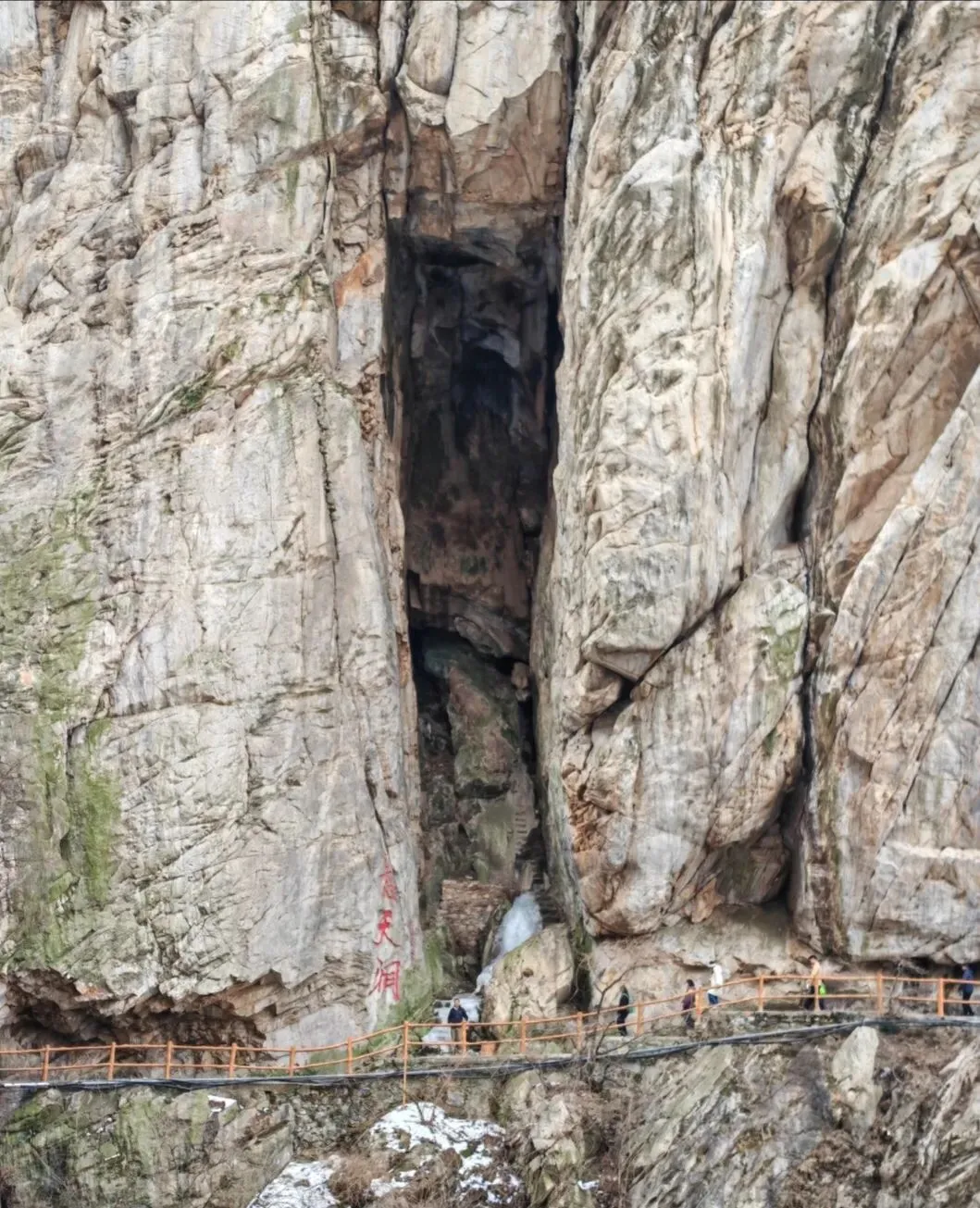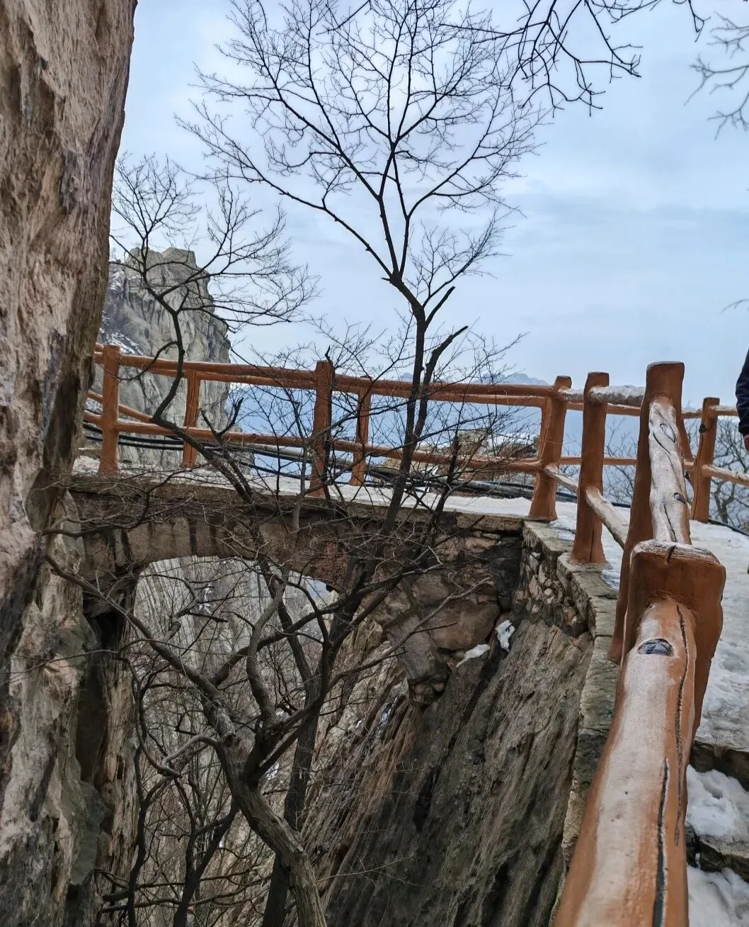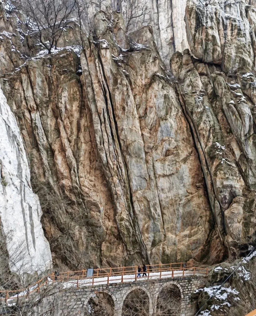 过嵩山揽胜就是书册崖,穿过书册崖便是石桥,望洛峰刻字石就在石桥后方的崖壁上,必须翻过石桥栏杆才能过去,而石桥下方是充满碎石块的陡峭沟壑。