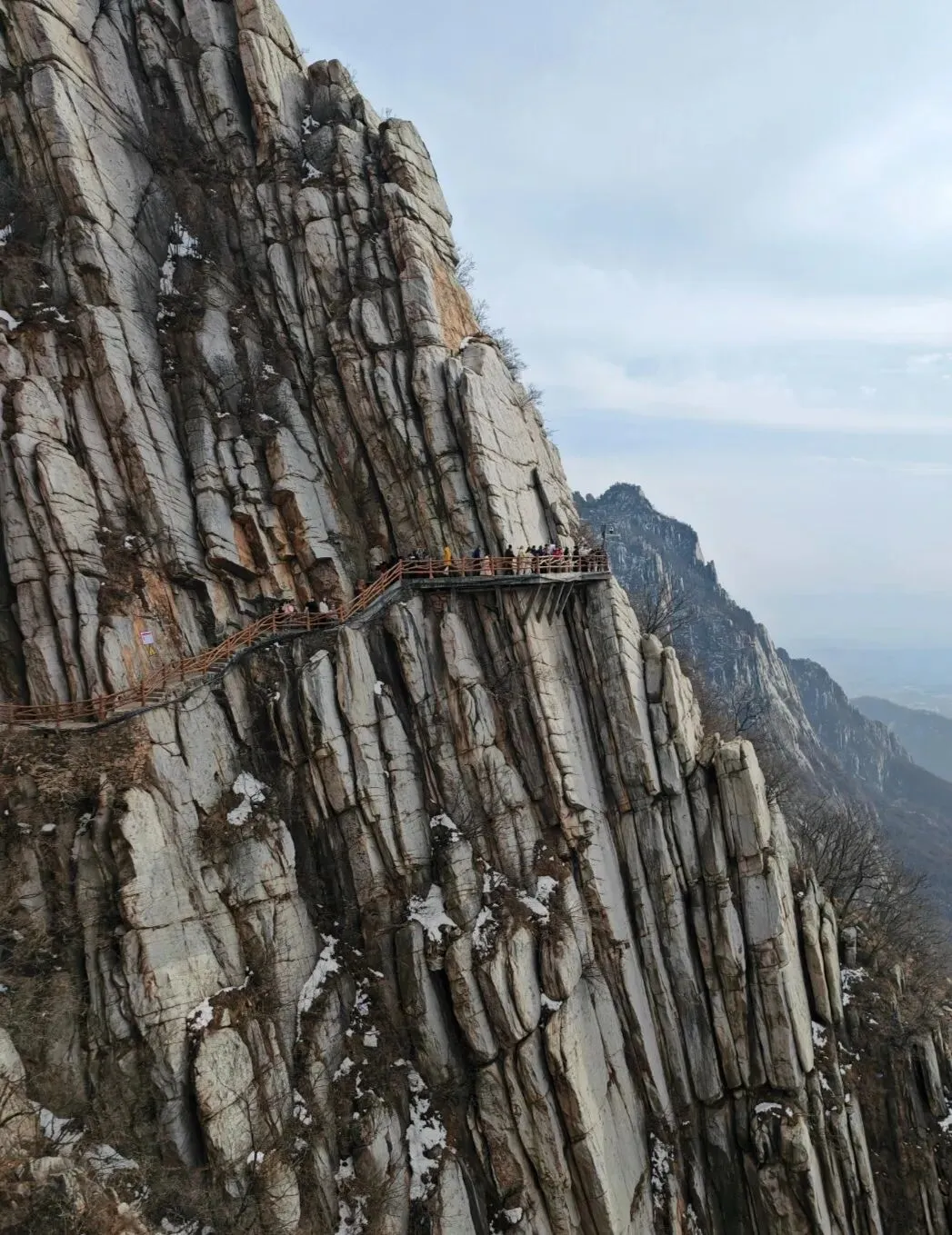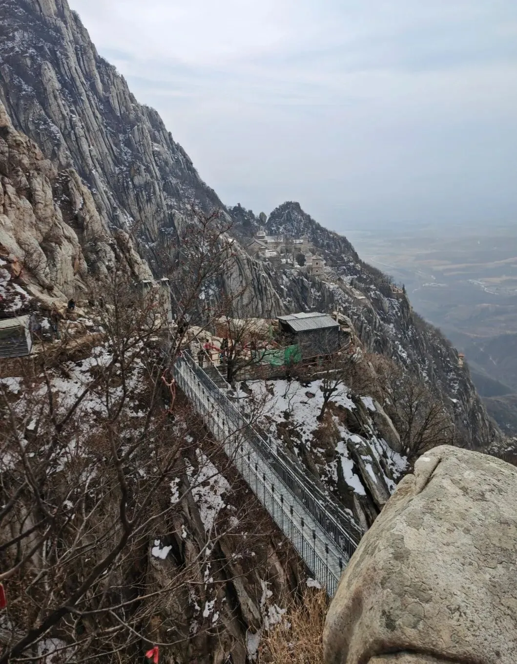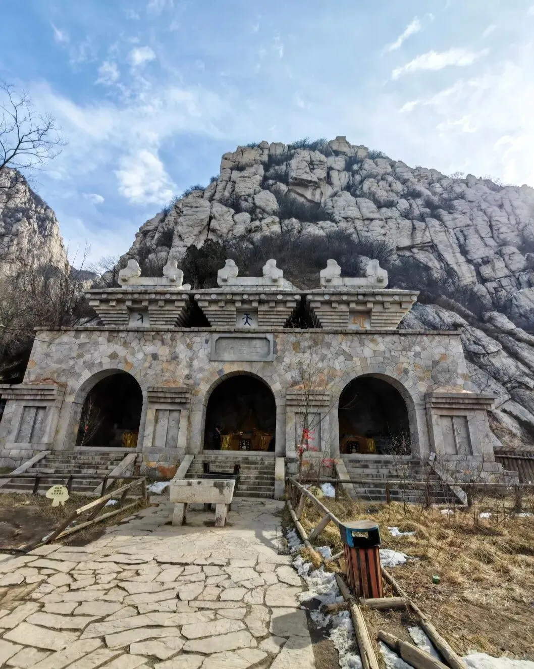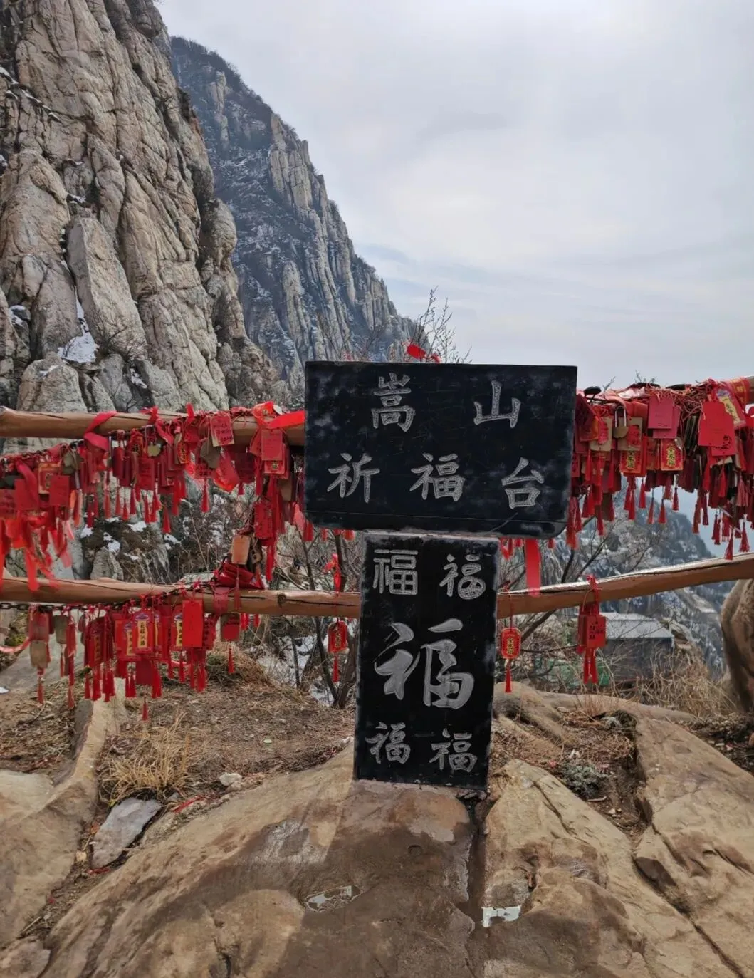 过嵩山揽胜就是书册崖,穿过书册崖便是石桥,望洛峰刻字石就在石桥后方的崖壁上,必须翻过石桥栏杆才能过去,而石桥下方是充满碎石块的陡峭沟壑。