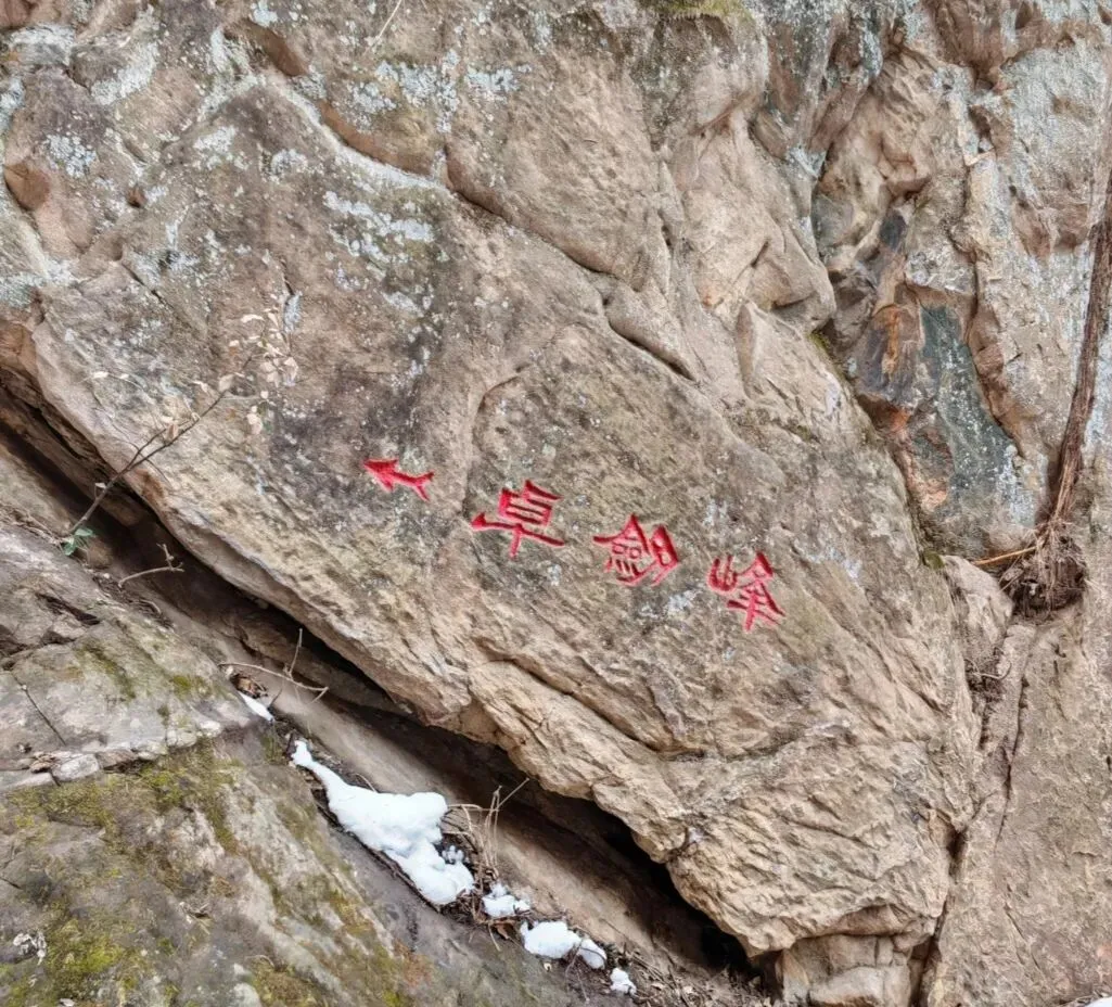 过象鼻石走十来分钟,我们在一座石桥下方的崖壁上发现了卓剑峰刻字石。于是便翻过桥栏来到刻字石前,遗憾的是字旁边有个指示箭头,像是路标,这让我们确定不了是不是官方刻字,还需进一步验证。