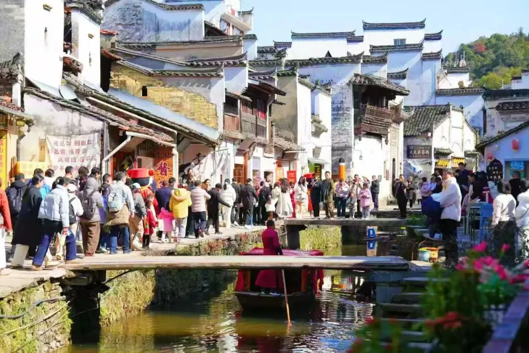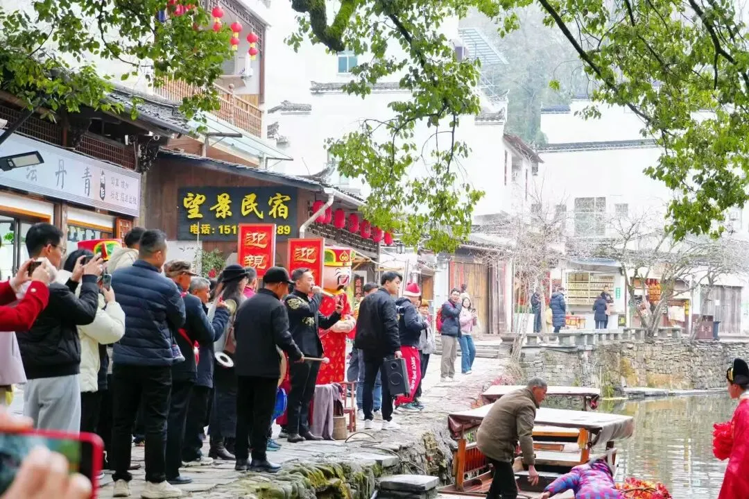 身穿凤冠霞帔的徽州新娘乘坐画舫沿溪巡游,迎亲队伍穿桥过巷,唢呐锣鼓声与溪水声交织,游客们争相与这支古色古香的迎亲队伍合影留念,孩子们踮起脚尖、伸出小手争抢糖果,欢呼声、笑声回荡在水巷之间,稚嫩的笑脸为千年婚俗添上最鲜活的年味。
