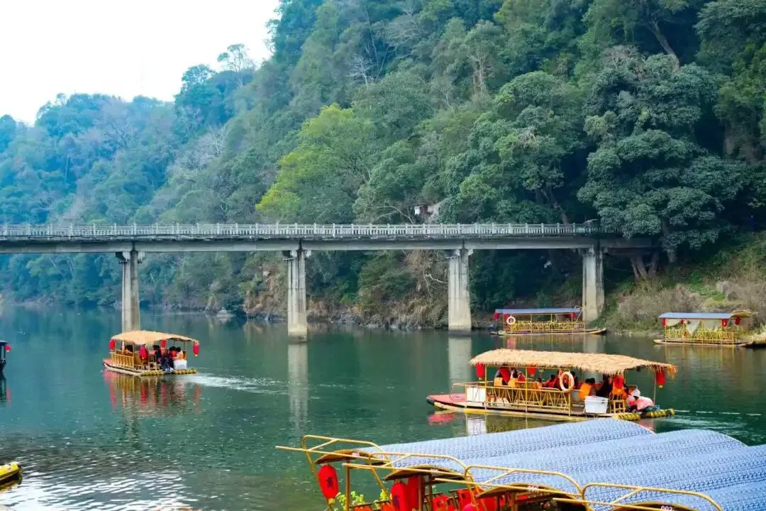汪口码头一派热闹景象,一艘艘竹筏次第出发,碧波映黛瓦,远山入画屏。两岸古埠、石桥、老宅缓缓掠过,人在舟中坐,宛如画中游。