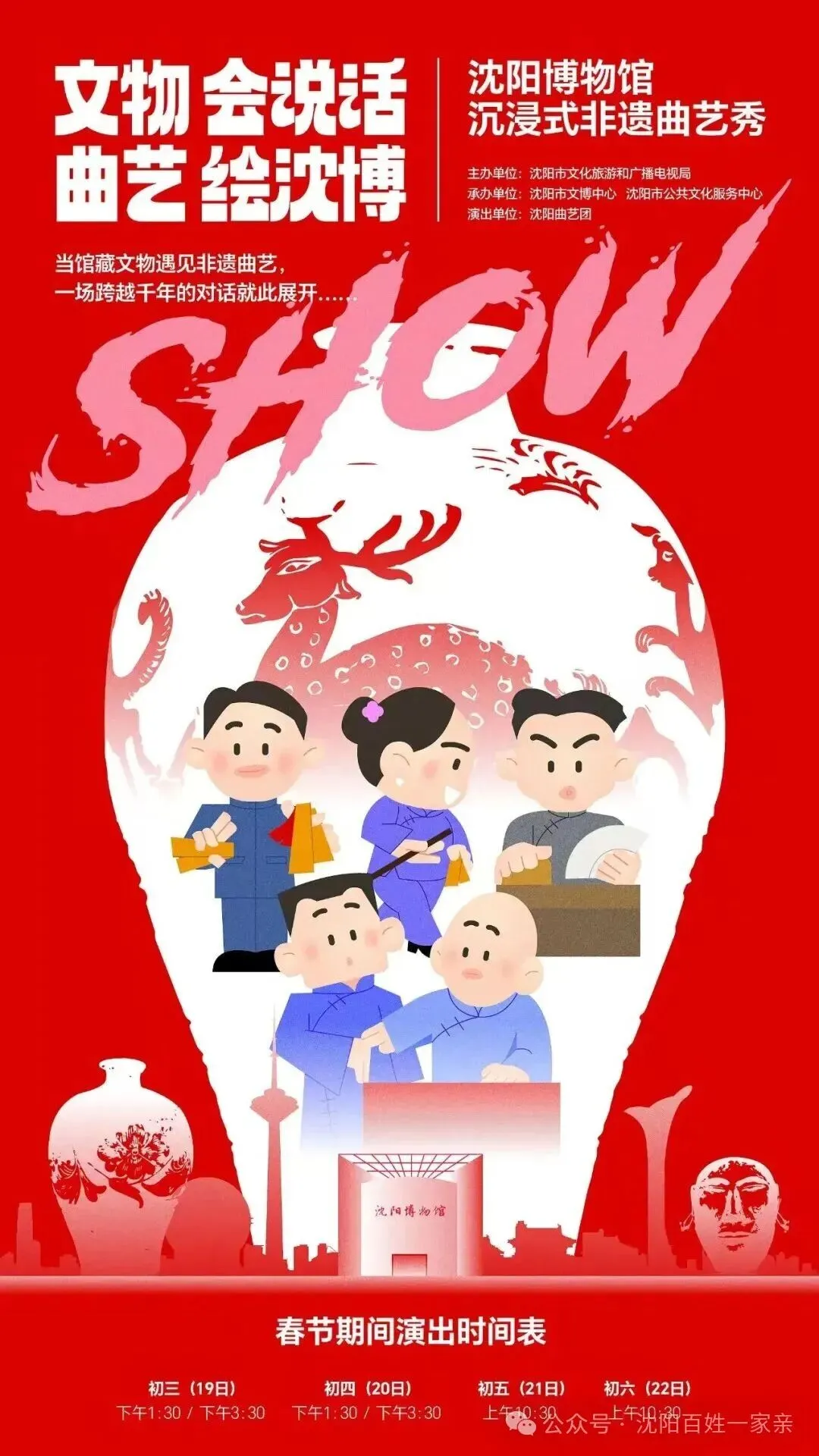 🏮亮点:以沈阳博物馆文物为蓝本,将沈阳历史、文物故事融入相声、评书、东北大鼓、快板等非遗曲艺形式之中,国有院团专业演员沉浸演绎,打破观演边界,让您置身历史场景,近距离感受非遗曲艺魅力与沈阳文脉、文博知识。