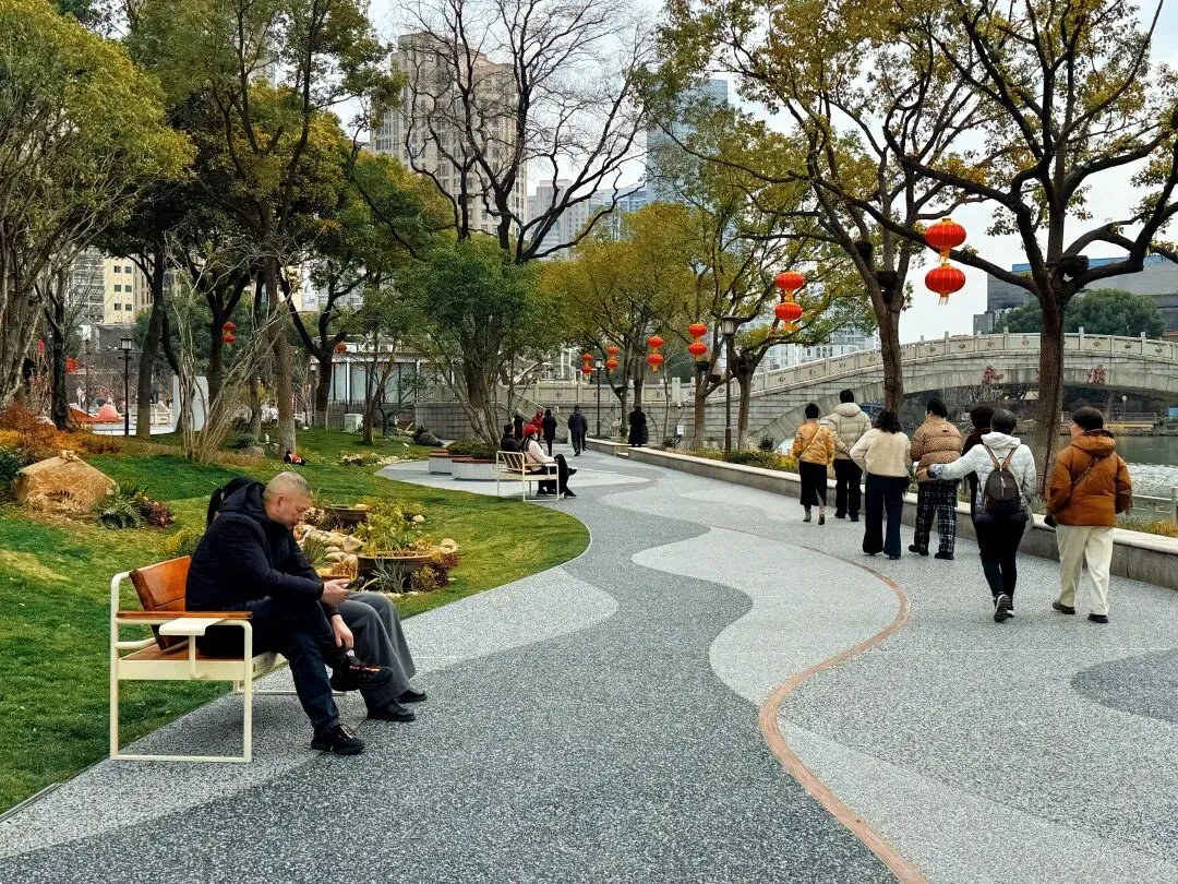 年初二,去年刚焕新改造的江尖公园人气满满,江尖艺仓现代雕塑与运河历史肌理相融,亲水步道、休闲驿站、全龄健身设施一应俱全。