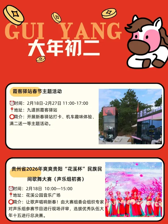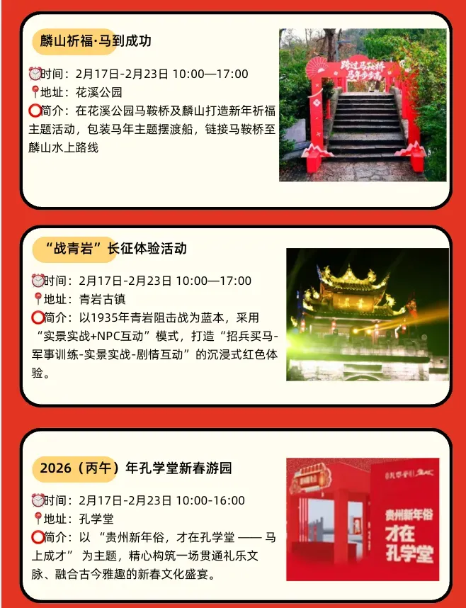 此外,天河潭旅游度假区设置了“马到成功”打卡墙,配合NPC互动、小丑杂耍、烟花秀和篝火派对,让你从白天嗨到夜晚。孔学堂则以“贵州新年俗,才在孔学堂——马上成才”为主题,通过礼乐活动和“溪山踏歌行”系列演出,为你献上一场底蕴深厚的文化盛宴。