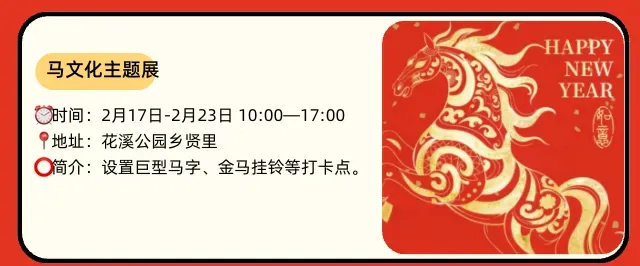 花溪公园无疑是春节期间的C位担当。从2月17日到23日(大年初一至初七),“马跃新春天天乐·非遗民俗过大年”系列活动轮番上演。你可以在水上花船巡游中感受视听震撼,在路边音乐会里放声高歌,也可以登上麟山祈福新年。特别值得一提的是,“金马挂铃·马跃花溪”马年文化主题展已正式开展,展期持续至4月,免费向公众开放,让你沉浸式感受马文化的独特魅力。
