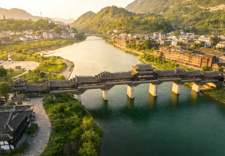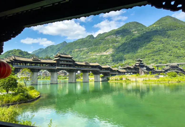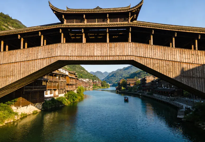 濯水风雨廊桥横跨于阿蓬江上,全长 658 米,是世界第一风雨廊桥。它集桥、廊、亭于一体,建筑风格独特,融合了土家族和苗族的建筑元素。