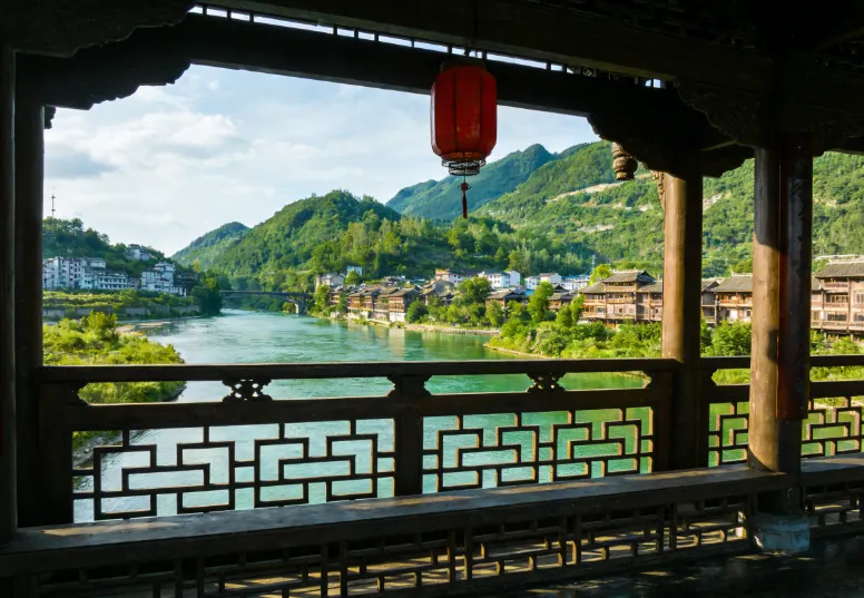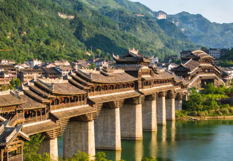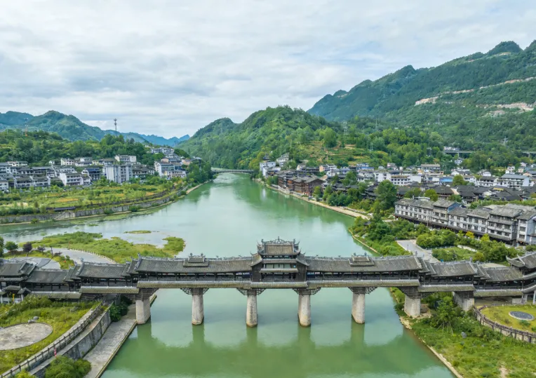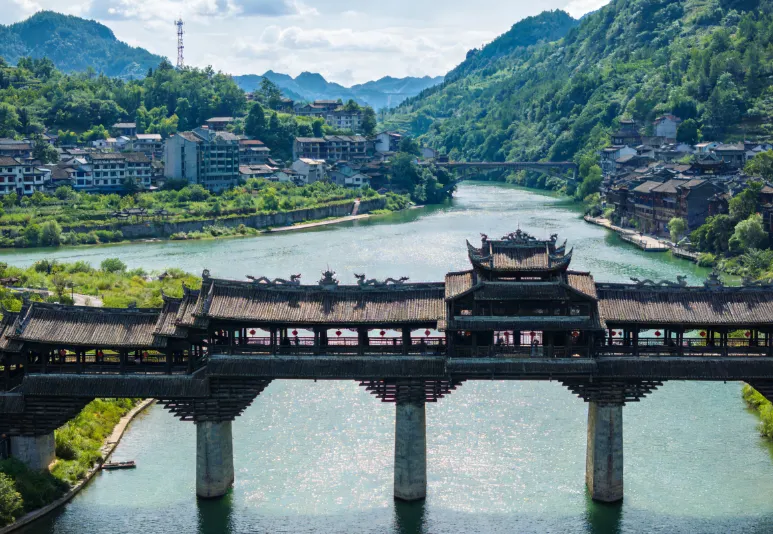 濯水风雨廊桥横跨于阿蓬江上,全长 658 米,是世界第一风雨廊桥。它集桥、廊、亭于一体,建筑风格独特,融合了土家族和苗族的建筑元素。