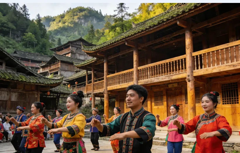你可以欣赏到土家族的传统歌舞表演,如摆手舞、茅古斯舞等,这些舞蹈动作古朴豪放,充满了原始的生命力。土家族的传统建筑吊脚楼错落有致地分布在山间,你可以走进吊脚楼,了解土家族的生活习俗和文化传统。此外,还能品尝到地道的土家族美食,如合菜、油茶等,感受土家族饮食文化的独特魅力。在这里,你可以深入体验土家族的民俗风情,感受民族文化的独特韵味。