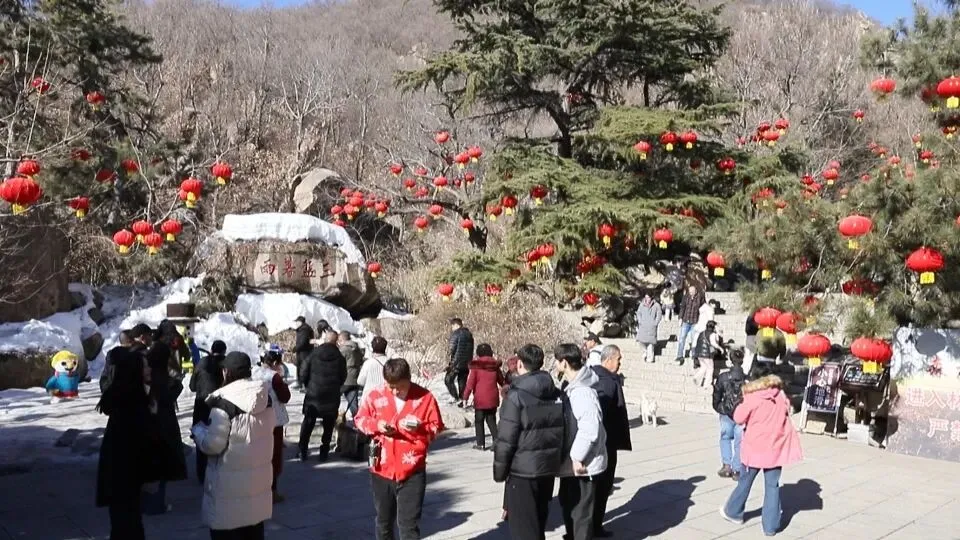 冬日的盘山,随处可见的枝头都挂上了红彤彤的灯笼,喜庆氛围拉满。游客们三五成群,悠闲的散步在山间古道。