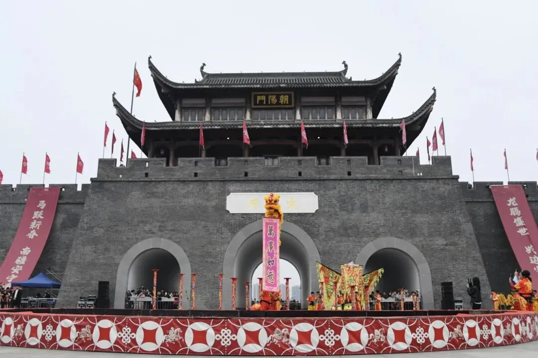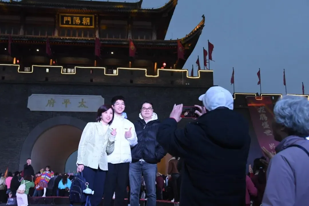 华灯初上,在朝阳门广场,一场盛大的开城大典拉开帷幕。演员们身着古装,以庄重肃穆的仪式,恭迎八方来客,瞬间将游客带进古色古香的太平府盛景中。仪式结束后,演员们走下舞台,与观众热情互动。大家纷纷上前合影留念,在城门楼璀璨灯火的映照下,记录下这穿越古今的奇妙瞬间。