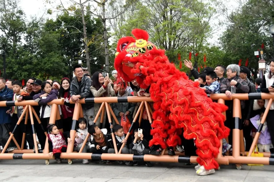 当天一早,古城街巷便锣鼓震天,祥狮献瑞采青仪式正在举行,两支舞狮队伍穿行其间,为沿街商家采青纳福。在商家门口,醒狮队伍通过一系列腾挪、跳跃动作,灵巧地采下悬挂于高处的生菜与利是,寓意瑞气临门、生财有道、步步高升。队伍所到之处欢声不断,围观游客纷纷举起手机,记录这一派祥和的开年景象。
