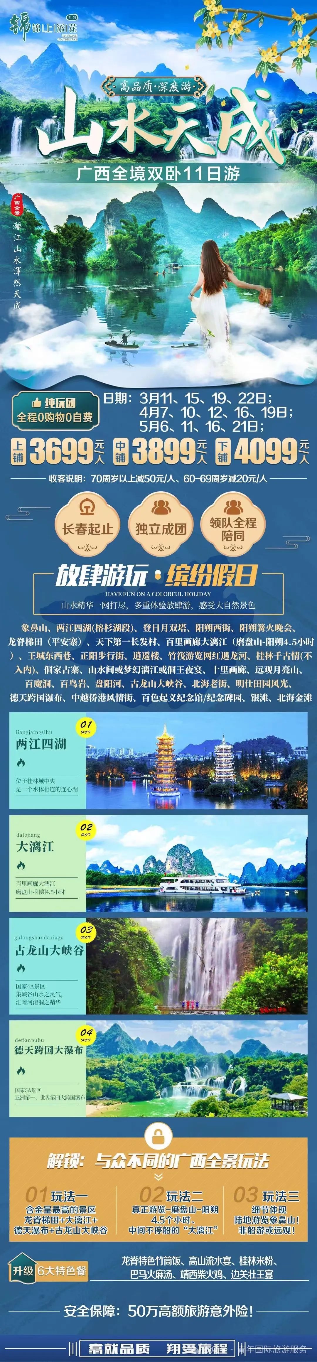 火车慢旅行/广西全景/3699元/人,长春出发/领队陪同/11日往返,大漓江/磨盘山/阳朔游船/龙脊梯田,百鸟岩/百魔洞/象鼻山