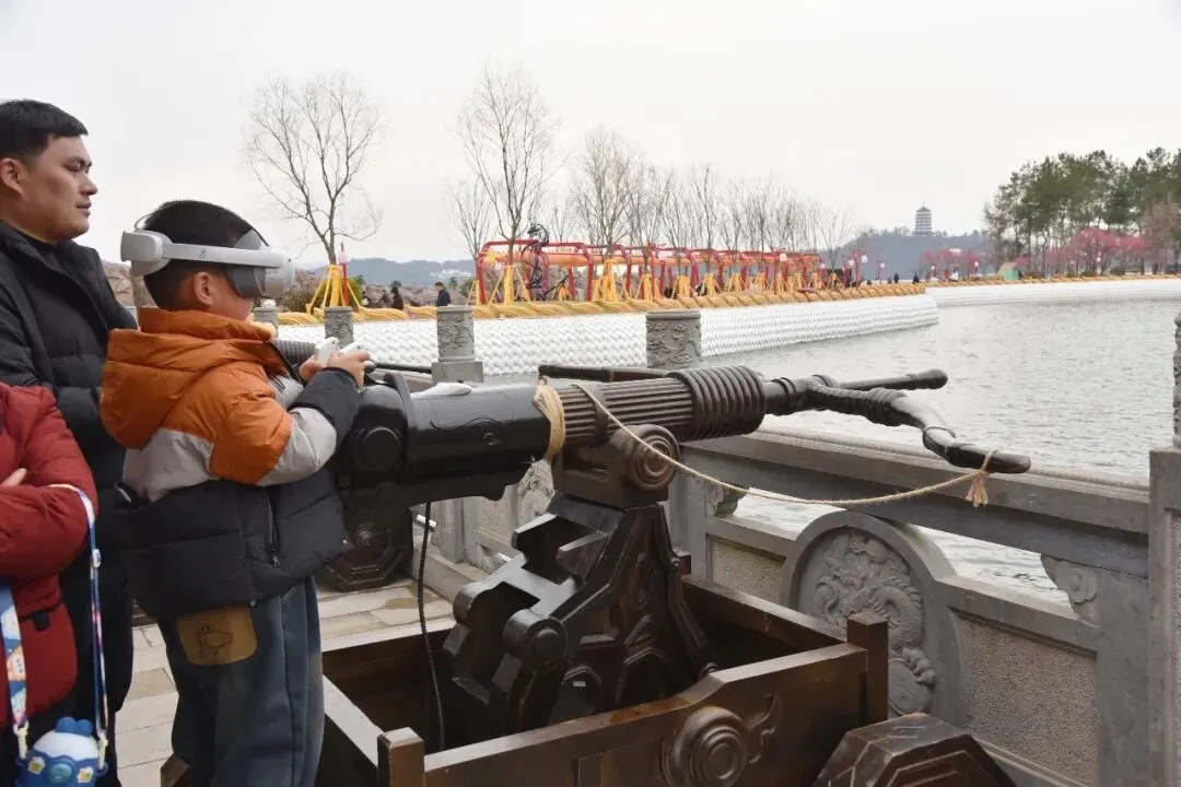 科技赋能,解锁湖山新奇趣感。这个春节,万佛湖以科技打破传统观光边界,全新升级改造后的龙王岛推出AR、MR、语音交互沉浸式体验项目,搭配震撼的水上舞狮表演,让游客在虚实交融中感受别样新春乐趣。游客登岛后便能与“镇岛守护神”四海龙王语音趣味互动,不管是龙文化典故还是景区游玩攻略,都有问必答;AR龙王树遗址、MR龙庭水战、VR飞龙在天等项目全天开放,游客扫描指定场景,虚拟光影便跃然眼前,穿戴专属设备,便能“置身”古战场参与水战,互动性与趣味性拉满,成为景区热门打卡点;最吸睛的当属水上舞狮,两名专业演员脚踩水上飞人飞行器,身着醒狮服饰在龙王岛水域完成跳跃、翻滚等高难度动作,水花飞溅间,非遗灵动与科技酷炫完美碰撞,引得岸边游客阵阵欢呼。