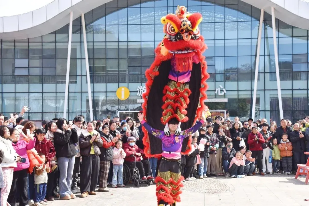 文化盛宴,传递新春美好祝福。万佛湖精心编排多场传统文化演出,分布在景区多个点位全天轮番上演,让游客在视听盛宴中感受文化魅力,在互动参与中收获欢乐与祝福。醒狮献瑞每天多场开演,四头彩狮完成点睛、登高采青等经典套路,表演后还会走进游客群互动,大人小孩纷纷抚摸彩狮、合影留念,寓意“沾狮气、纳吉祥”,脸上洋溢着幸福笑容;周瑜岛大戏台是传统文化展演核心阵地,绣球招亲沉浸式还原民俗场景,邀请游客参与互动,欢声笑语中感受传统乐趣,乡音里的中国年·方言挑战赛,让游客用本地方言送祝福,在互动中增进情谊;此外,琴舞和鸣演绎国风浪漫,墨宝赠春为游客免费送上吉祥福字,竹竿踏歌带领游客共跳欢舞,各类互动节目让游客全程沉浸在新春的热闹与欢喜中。