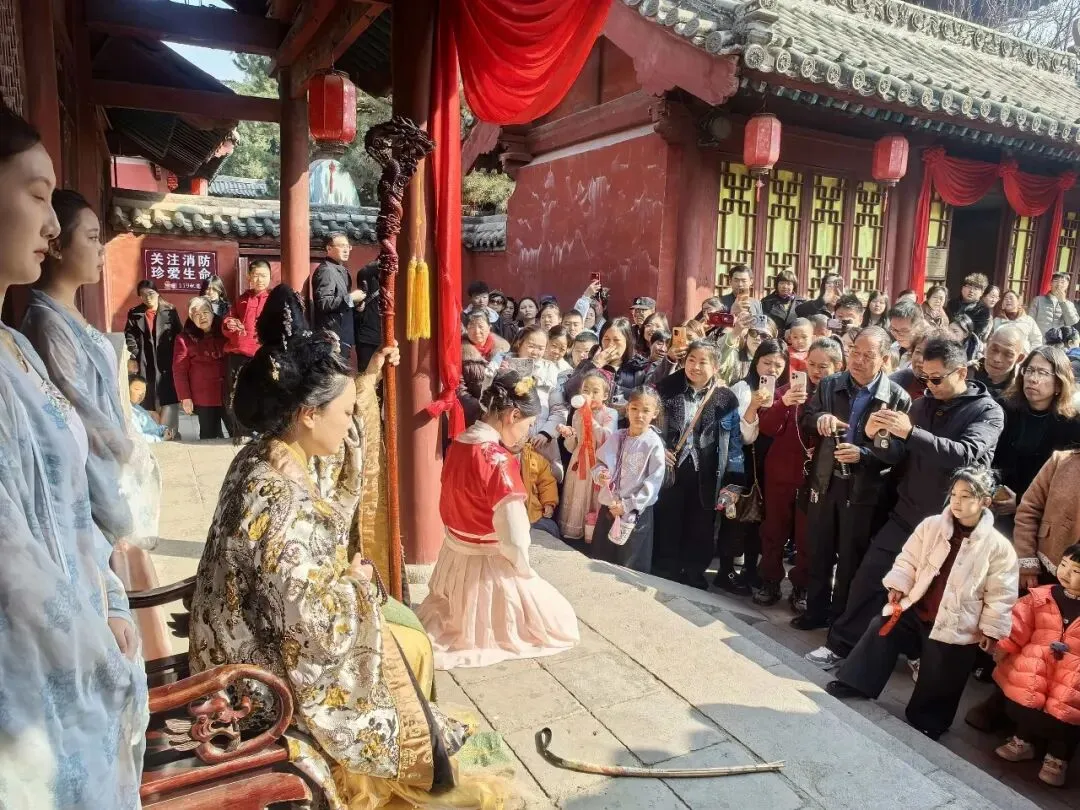 绕莺莺塔三圈,祈姻缘、求平安;在月老殿抢红线,与红娘互动;看折子戏,论红娘机智救场;去商业街当捕快,给“铁人兄弟”戴枷锁;挂祈福牌、手工拓福,把福气带回家!