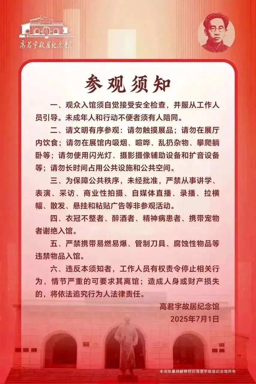 高君宇故居纪念馆景区实行团体参观讲解预约制,需提前一周电话预约(0351—5391158)也可进入“高君宇故居纪念馆”微信公众号“数字服务——AI讲解员”以及云展览实景讲解,聆听线上讲解。请大家合理安排出行时间,文明有序观展。