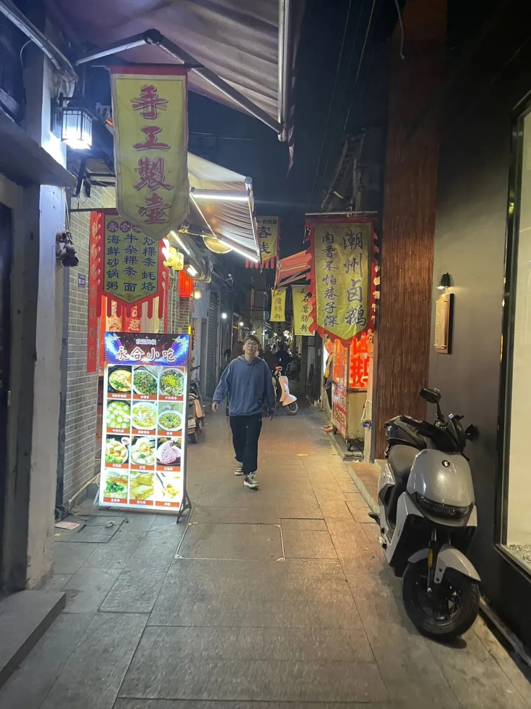 晚上不想去远处,就在楼附近吃了一碗裸条汤,和上次吃的那个差不多,上次那个10元,这个就要25元,味道还不如上次那个。景点的东西就是性价比太低。而且人很多,都是拼桌。我对面坐着一位从安徽跟团过来旅游的女士,也50出头了。跟团4晚5天1700元(她一个人住,不包括大交通),说晚上8点看10分钟灯光秀(人太多根本看不到)然后要去一百多公里的地方住,到酒店得晚上11点了。而且有购物,她买了一个转运珠一千多,玉的。这就是跟团游便宜的原因:住的远,有购物。四晚五天把潮州、汕头和揭阳都逛遍了,中午团餐,晚上自己吃,早上在酒店吃。根本吃不到真正的当地美食。而且起早贪黑的很累。而且要说便宜比旅居还是贵。
