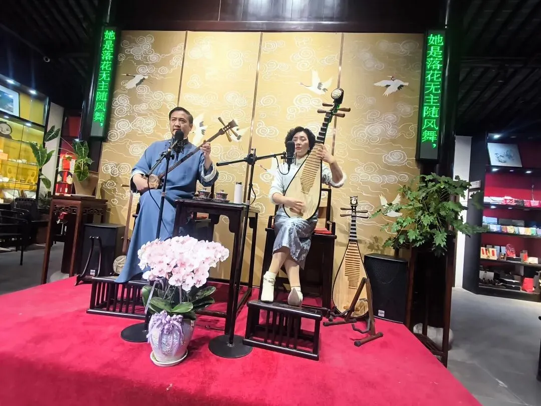 一路找到一家评弹馆,听了三段弹唱,演员身后的屏幕上配有唱词翻译,虽然要对照着字幕才能听懂,但琵琶与三弦合奏的音乐让人动人心弦。
