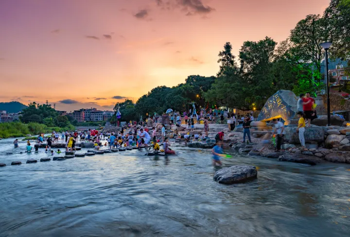 夜幕降临,记者来到金谷溪岸文艺村,这里灯火通明,鱼形“移动酒吧”内,游客们举杯畅饮;“憨直”艺术餐车旁茶香四溢,好友围坐品茗。茶香、艺术与乡村夜景交织,让文艺赋美乡村成为动人实景。