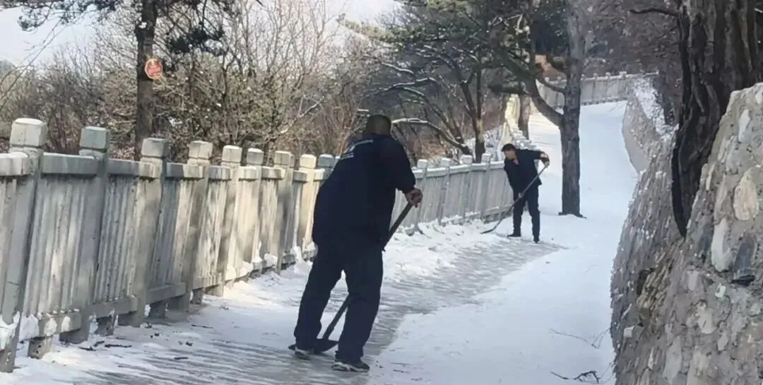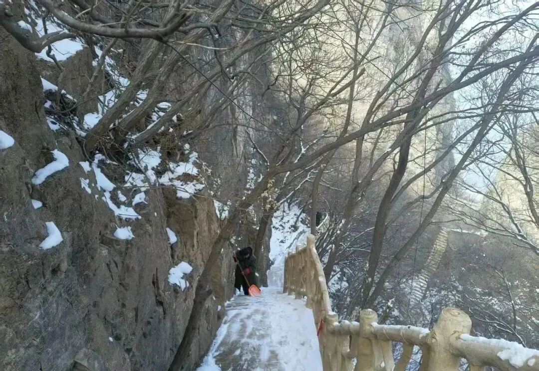 大年初一的清晨,五老峰景区寒意袭人。受低温影响,部分路段仍有积雪残冰。为确保游客行走安全,工作人员早早到岗,拿起铁锹、扫帚,顶着寒风除冰扫雪。他们的身影在山间穿行,脚下是冰雪,心中却是游客的平安。路面渐渐干净,游客的脚步也更加从容。