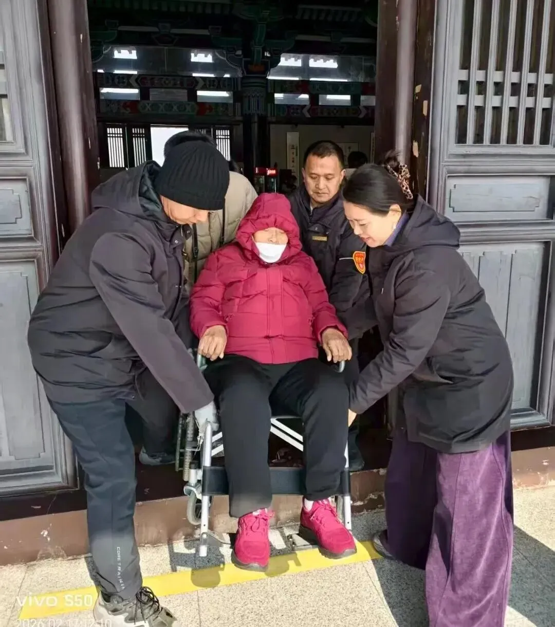 在鹳雀楼景区,一位年迈的老人步履蹒跚,工作人员立刻上前搀扶,细心陪伴,缓缓前行。遇到坡道台阶,便推来便民轮椅,护送老人轻松通行。一路上,老人脸上始终挂着笑容,连声说着“谢谢”。这些细微的照护,让老年游客也能悠然自得地欣赏风景,感受到节日的温情与尊重。