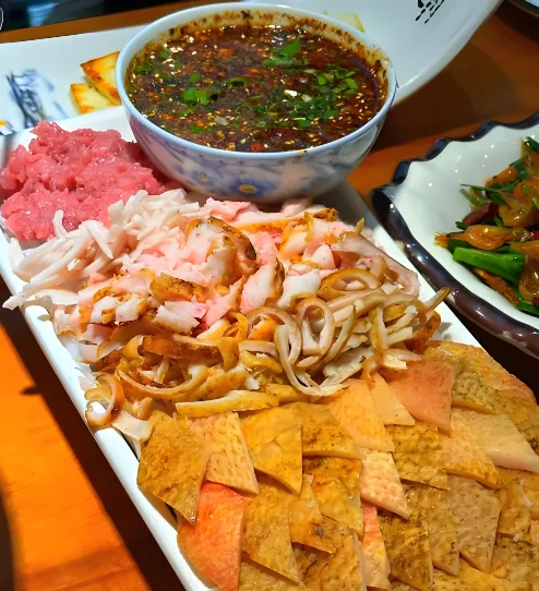 第四美食:生皮——白族的生食美学这是道“硬菜”,也是白族的传统。选用猪后腿肉,用稻草火烧去毛,皮烤得焦黄,肉却还是生的。切好后蘸上梅子醋、辣椒、蒜泥调的蘸水,皮脆肉嫩,酸辣开胃,完全没有腥味。推荐去周城村的农家乐吃,比如“蓝续扎染体验店”旁边的餐馆。人均50元左右。