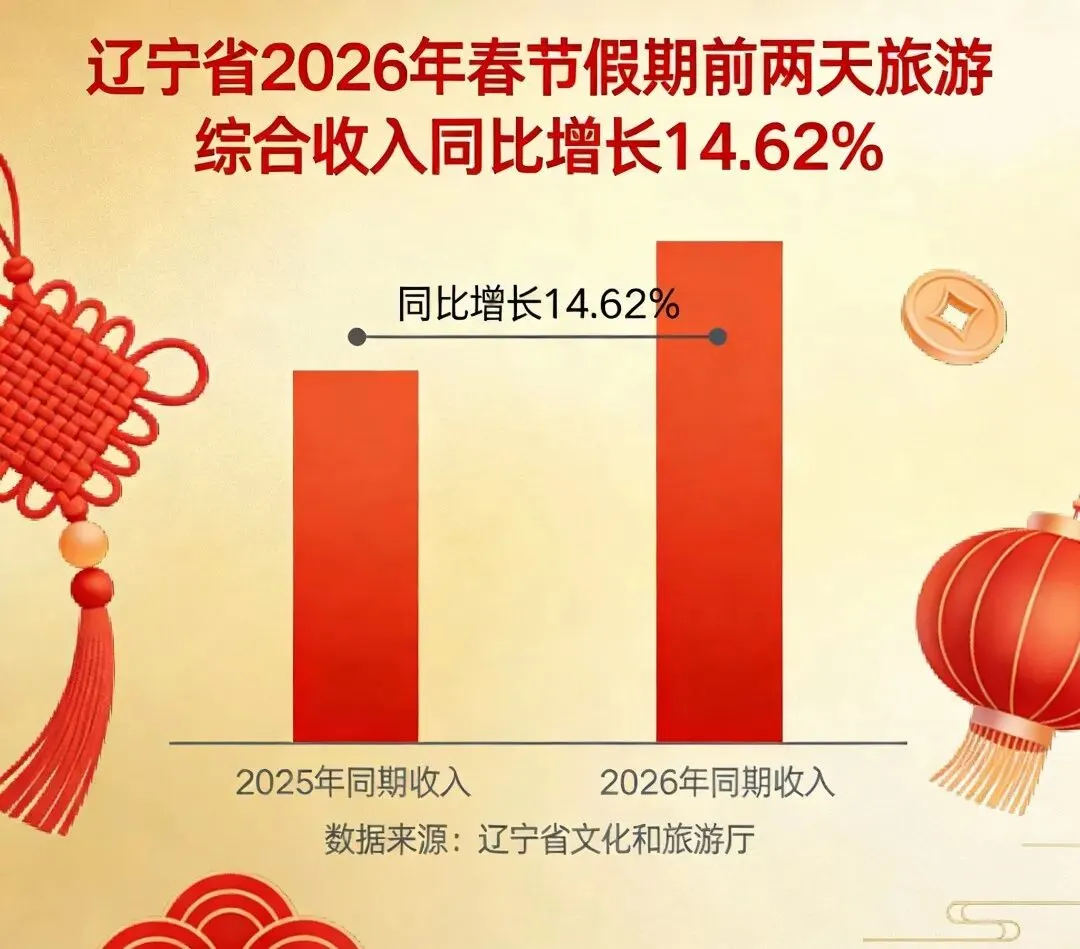 根据辽宁日报报道,大数据测算,辽宁省2月16日15时前,春节假期第二天全省接待游客人次同比增长15.90%;旅游综合收入同比增长14.62%。全省9家一级博物馆接待观众人次同比增长17.3%。