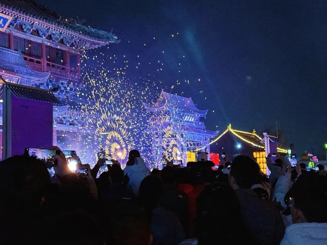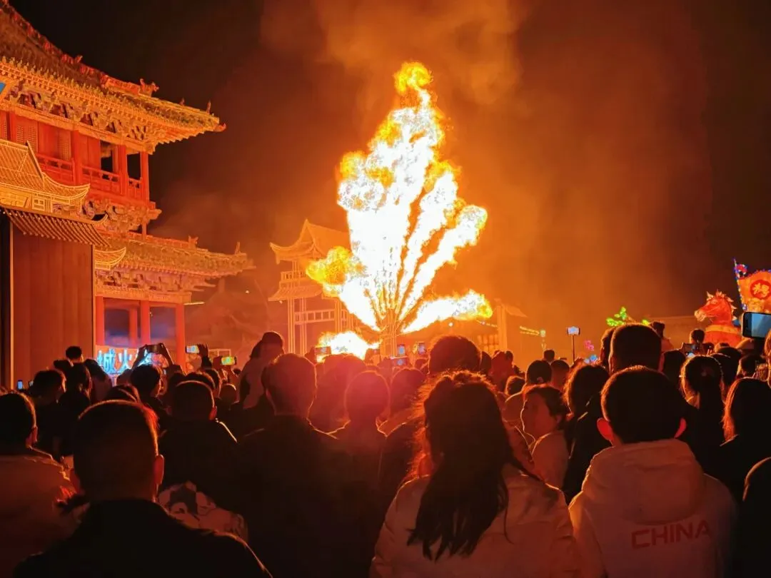 更令人惊喜的是,烟花瀑布、火壶表演、凤凰飞天、空中杂技、篝火晚会等特色节目轮番上演。非遗火壶的烈焰在夜空中划出优美弧线,凤凰飞天的光影特效震撼人心,篝火旁的游客手拉手载歌载舞,每一处都充满了欢声笑语。移步换景间,一步一景,一景一乐,沉浸式的体验让每一位游客都能感受到新春的热闹与喜庆。
