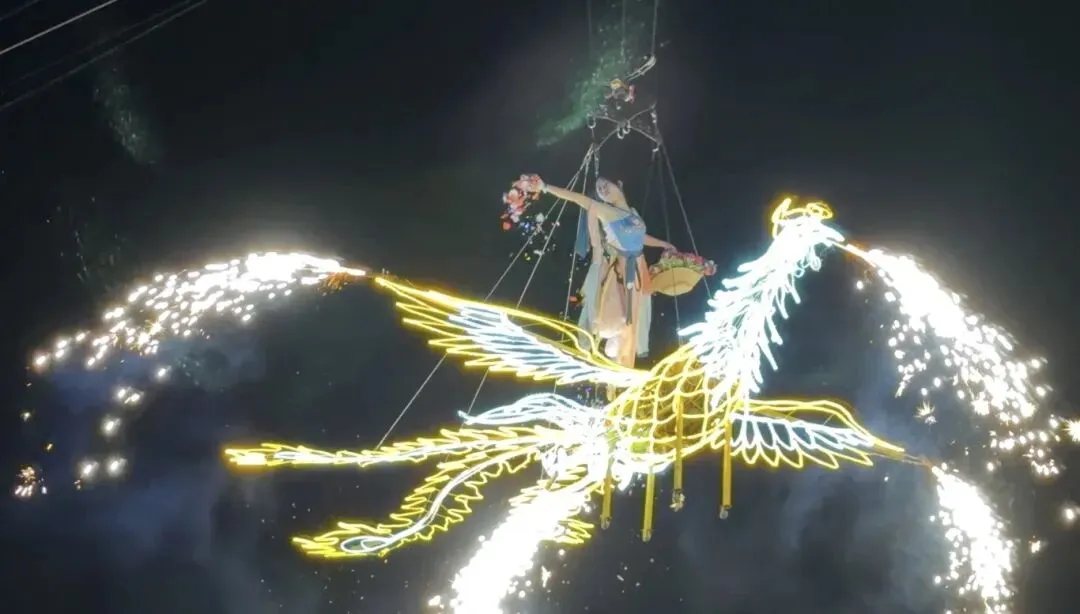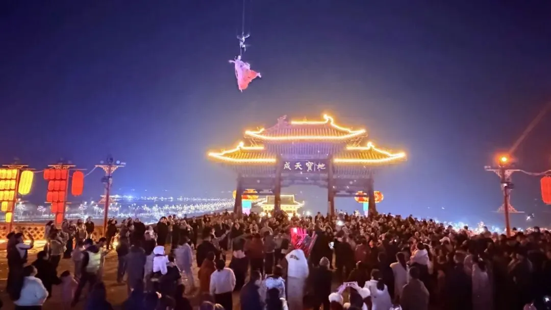 静态的灯展之外,动态的演艺更是将氛围推向高潮。舞台上,国风舞蹈秀衣袂飘飘,每一个动作都尽显东方韵味;杂技表演惊险刺激,引得台下阵阵惊呼。高空之上,“天女散花”的曼妙舞姿徐徐展开,彩绸翻飞,花瓣纷飞,让人仿佛穿越古今,置身仙侠幻境。