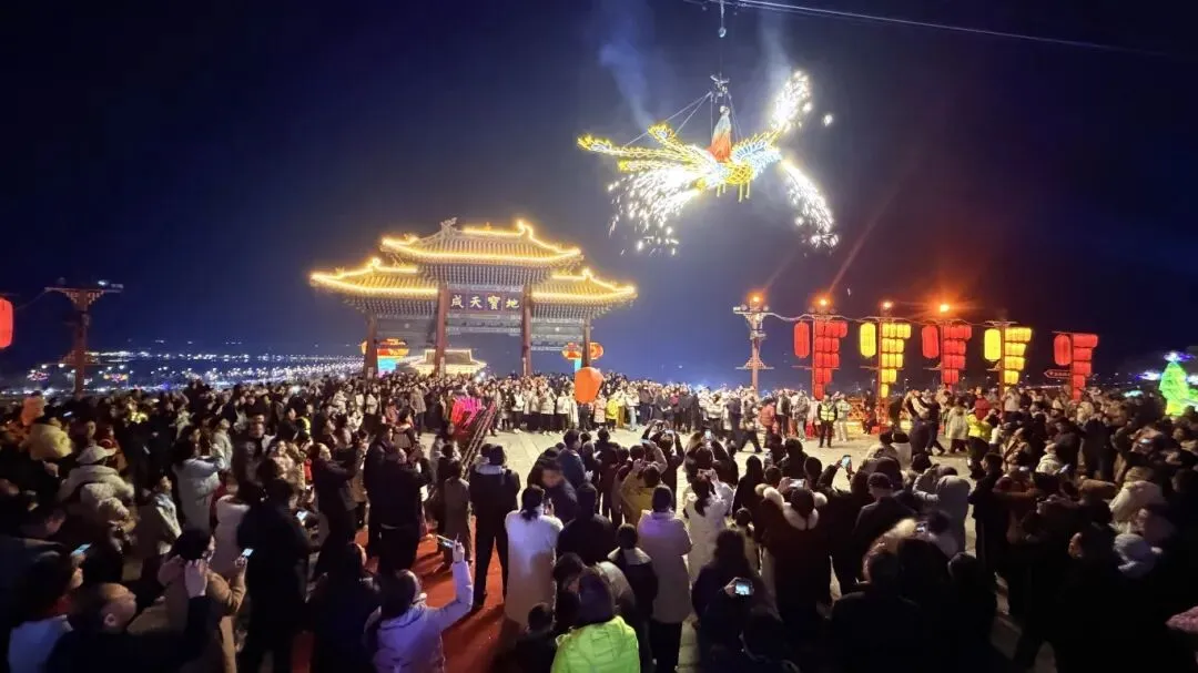 更令人惊喜的是,烟花瀑布、火壶表演、凤凰飞天、空中杂技、篝火晚会等特色节目轮番上演。非遗火壶的烈焰在夜空中划出优美弧线,凤凰飞天的光影特效震撼人心,篝火旁的游客手拉手载歌载舞,每一处都充满了欢声笑语。移步换景间,一步一景,一景一乐,沉浸式的体验让每一位游客都能感受到新春的热闹与喜庆。