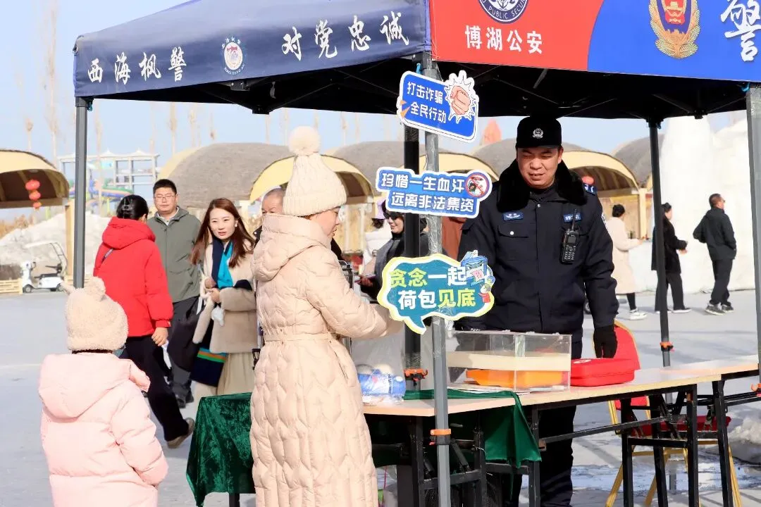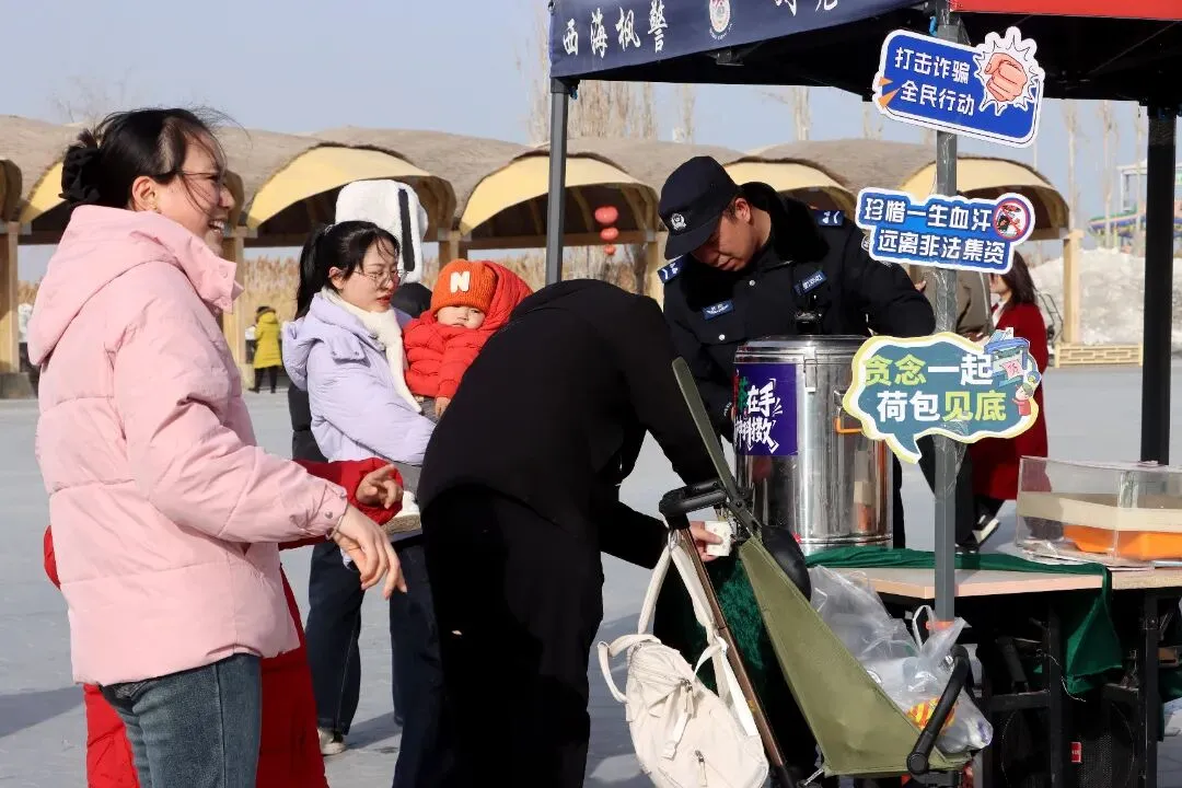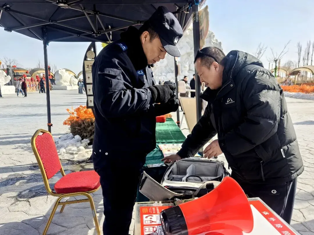 正说着,一个年轻男子推着轮椅在服务点门口停下。轮椅上是个老太太,裹着棉衣,围巾把脸包得只剩眼睛。他想带母亲到雪雕跟前拍张照,又怕人多不好推。民警把轮椅接过来,推到雪雕前一块平整的地方找好位置,给他们拍了张合影。拍完照,老太太说了句话,声音轻。儿子听完,说:“我妈说谢谢你。”民警摆摆手。儿子推着轮椅往景区深处走,老太太回头,朝服务点点了点头。