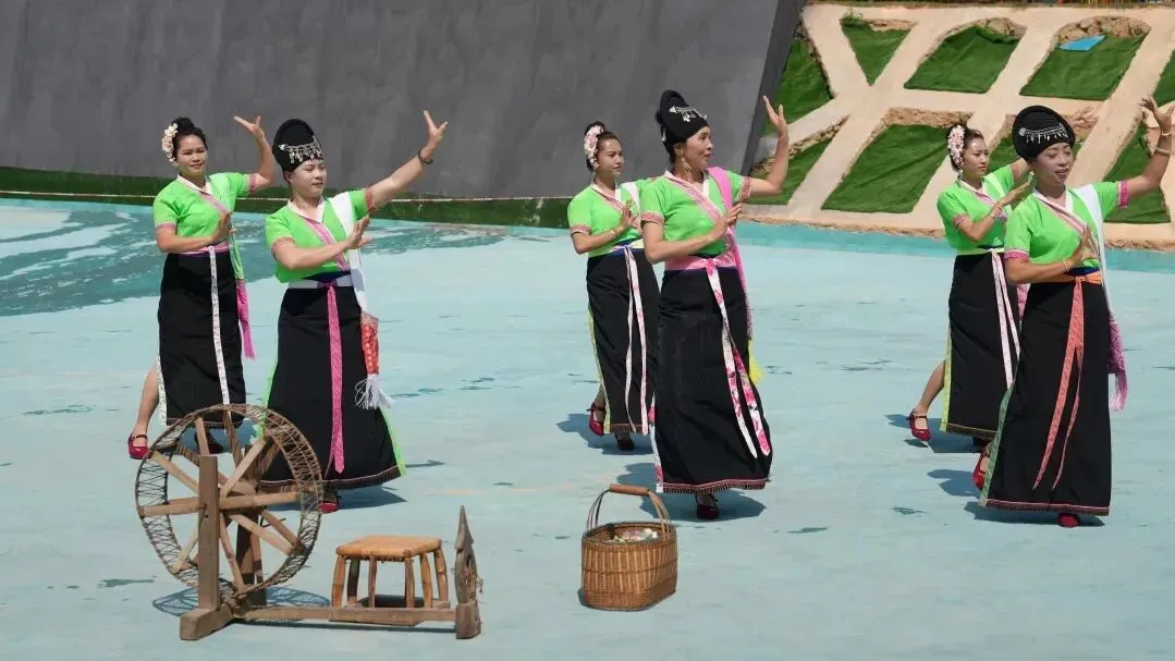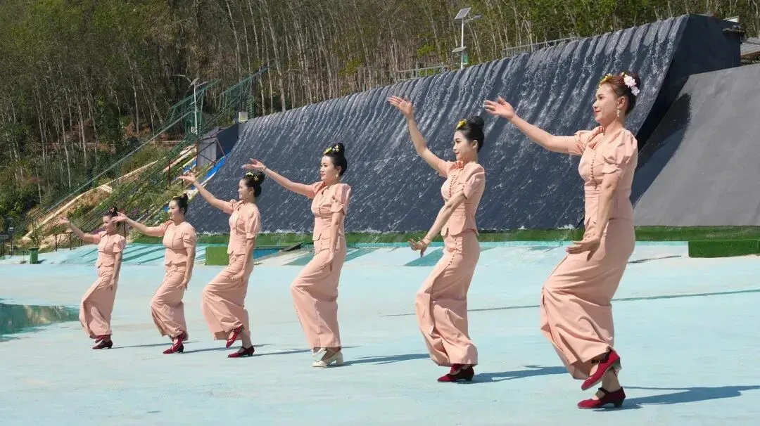 午后,欢腾的人流涌向露南漂流景区。迎宾祈福仪式上,各民族代表手捧清水,为远道而来的游客轻点指尖、献上祝福。随后,一支流动的舞蹈队沿泼水池翩然起舞——傣家的孔雀舞柔美灵动,哈尼的竹筒舞热情奔放,拉祜族的丰收舞轻柔舒展……每一段舞步都诉说着一个民族的故事,每一次旋转都交织成中华文化的美美与共。