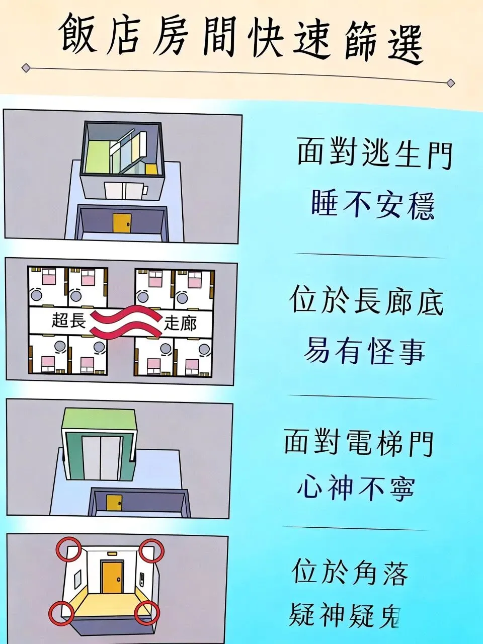 哪些地方容易有能量的暂留现象呢?中国风水也呼应科学理论,酒店的居室如果面对逃生门,可能因为气流的关系睡不安稳。至于长廊的居室,就像是我最无眠的夜,就是位于长廊的最底部。另外面对电梯门的居室,可能因为电梯开开关关·产生气流而住起来心神不宁。至于酒店里位于角落的居室,则容易让人疑神疑鬼。