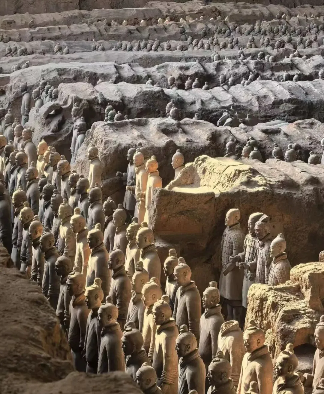 两千年风雨尘封,掩不住帝国锋芒。三座俑坑布局严整,近8000件陶俑、陶马按真实军阵排列,与真人真马等大等高,气势恢宏如临沙场。一号坑步兵方阵横空出世,千军万马肃立待发;二号坑兵种齐全,跪射俑、骑兵俑、车兵俑错落有致,尽显秦军攻守兼备的战力,三号坑作为指挥中枢,暗藏古代军事谋略的精髓。站在俑坑前,仿佛能听见战鼓擂动、马蹄铿锵,亲眼见证大秦横扫六合、一统天下的赫赫雄威。