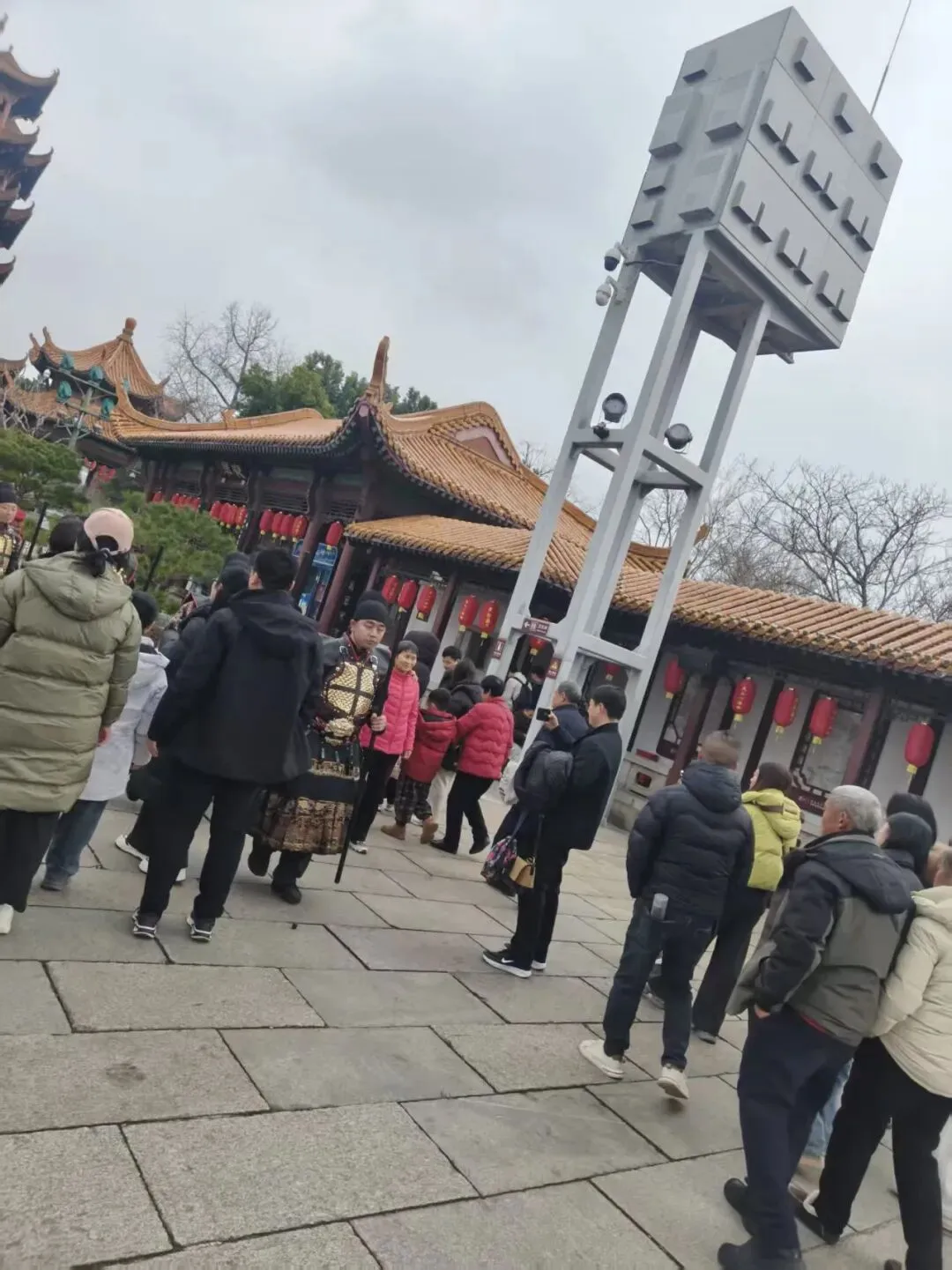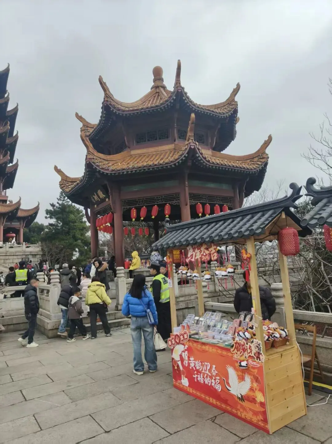 因为是假期,游客特别多,还没进园区大门,人已经比肩接踵。透过人群,望见黄鹤楼高高地耸立在蛇山之上。蛇山与对面的龟山遥遥相对。这才理解了伟人诗词中的句子“烟雨莽苍苍,龟蛇锁大江”的含义。