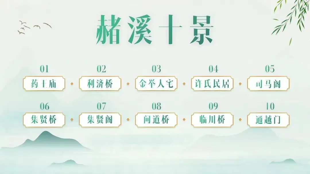 以下是一些主要景点介绍:药王庙始建于清乾隆元年(1736年),是全国少见、浙江仅存的药王庙,融合儒释道三教文化,曾是天台中草药材交易集散地,现布局展示中草药文化和禅意养生理念。利济桥又名小西门桥,始建于吴赤乌年间,曾是天台古城八门之一的利济门外桥梁。上世纪七十年代改建为平拱桥,保留了历史风貌,是改革开放的见证。金举人宅清代四合院古建筑,建于道光二十三年(1843年),宅主为武举人金飞龙。现入驻钟书阁,是体验唐风宋韵的网红打卡地,庭院美学布景以四季为主题。司马阁为纪念唐代高道司马承祯而建,他是道教上清派第十二代祖师,李白、王维等诗人曾慕名而来。阁内展示司马承祯的生平、著作及与唐代帝王的交往场景。集贤阁阁内供奉文昌帝君,是天台山历代能人贤士荟萃的文化高地,体现“三教合一,万善同归”的和合理念。问道桥为纪念李白、孟浩然、王维、贺知章等仙宗十友而建,桥栏杆采用木材加金属构件,桥面采用仿古石材铺装,是赭溪老街的标志性景观之一。临川桥始建于南宋隆兴二年(1164年),为纪念县令王琰而建,现存为清康熙六年重修的三洞拱式石桥,是县级文保单位,桥身记录着人间烟火味。通越门旧时天台县的西城门,曾是商贸繁荣的见证者。新建的城门采用现代手法打造,运用灯光效果,成为新潮的打卡地。二十四节气广场地铺石上雕刻着二十四节气图,融入天台人的传统习俗,如清明青饼、立夏白药酒、冬至冬至圆等,是感受节气与万物联系的场所。“水中月”古戏台按照明清建筑风格还原老天台传统戏台风貌,每逢节假日会举办越剧等各类演出,寓教于乐,承载着社会教化传统。这些景点融合了历史、文化、民俗与现代创意,展现了赭溪老街“唐风宋韵、潮玩地、和合味”的独特魅力。