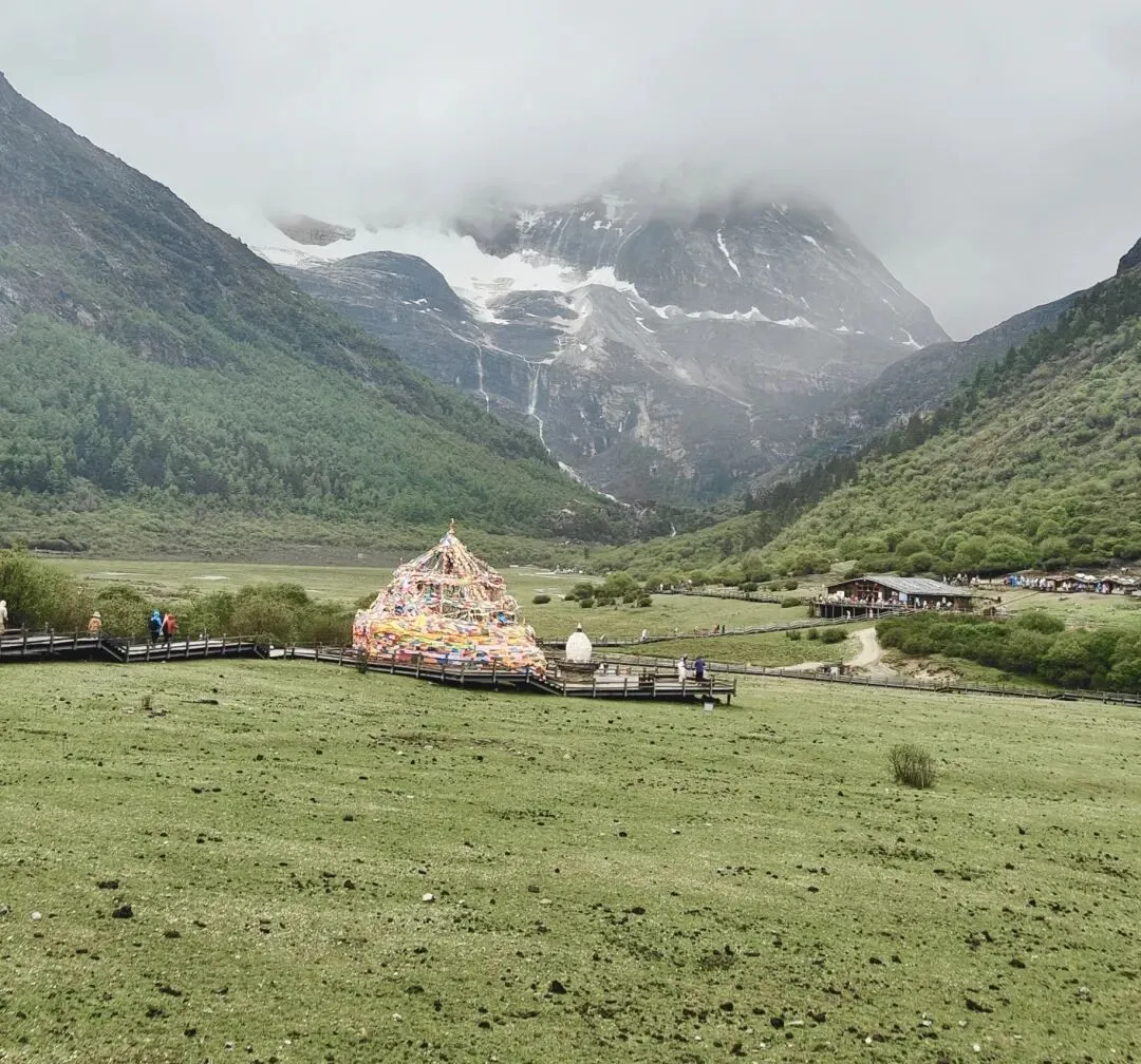 网上推荐先玩短线,通往珍珠海的路很平缓,走起来毫不费力,湖水碧绿清澈,把雪山、森林完整地倒映在水中,随便一拍都是壁纸级别的美景,不用滤镜也足够好看。在这里玩够了,我们才正式挑战传说中累到崩溃的长线, 坐上电瓶车抵达洛绒牛场,眼前是开阔的草甸,溪流缓缓流淌,三座神山环绕四周,牛羊悠闲地吃草,仿佛走进了童话世界。但从这里开始,徒步才真正开始。海拔越来越高,每走一步都觉得喘,心跳得飞快,走几步就要歇一歇,身边全是一边喘气一边互相打气的游客。 山路崎岖,风也很大,好几次都想放弃,但想着来都来了,还是咬牙坚持。等爬到牛奶海的那一刻,所有疲惫瞬间烟消云散。湖水呈现出绝美的蓝绿色,被雪山环抱,安静得像一块宝石,再往上走一段就是五色海,在阳光照射下变换着不同的色彩,清澈又神秘,站在湖边,看着巍峨的雪山,心里只剩下震撼和安静。