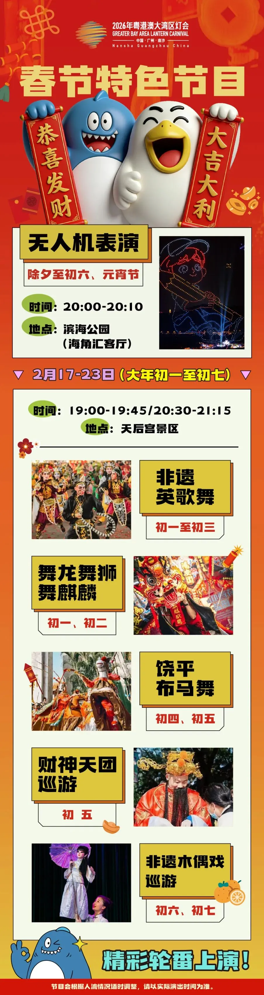 绝美灯光秀+无人机表演盛宴!来看看那些刷爆朋友圈的春节限时看点:即日起至5月10日《南沙之夜·湾区之光》灯光秀;即日起至2月22日、3月3日(除夕至初六、元宵节1000架次无人机表演;还有英歌舞、非遗木偶戏巡游、饶平布马舞等陪你过大年。