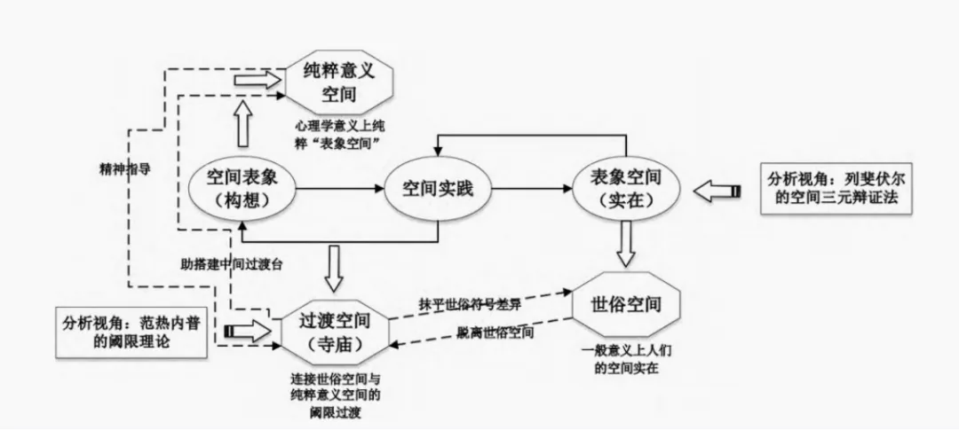 寺庙作为区隔于世俗空间和走向抽象意义上的心理学表象空间的过渡型空间,不仅是一种范热内普概念上的特殊阈限,也是一种调节空间表象和表象空间的特殊空间实践。在寺庙内部体现着列斐伏尔的空间三元辩证法的核心范畴,即既能用社会和历史来解读寺庙空间,又可用寺庙空间来解读社会和历史,并使用“空间表象—空间实践—表象空间”的“回溯式进步”来强调“社会—历史—空间”三者之间的辩证统一关系,从而使任何社会个体在各种空间之间保持清醒并游刃有余。在寺庙之外的世俗社会和纯粹的心理学意义上的表象空间之间,寺庙作为一个特殊的空间实践,以一系列符号差异区隔于世俗空间。随后,本文不再使用列斐伏尔的概念,而是用心理学纯粹的表象概念指代纯粹构想的“佛祖”或者“天堂”,并借助范热内普的阈限理论,整合改造列斐伏尔的空间三元辩证法,搭建起世俗空间、过渡(抽象)空间和纯粹意义空间的具体的空间形态,从而建构起新空间三元辩证法解释框架,如图2所示。因此,寺庙空间作为一种特殊的范热内普意义上的阈限与过渡性的空间形态,为分析当代青年热衷于寺庙旅游的成因提供了一种沉浸式体验的空间场景,具体表现在:一是区隔于充斥符号标签的世俗空间的特殊空间,二是走向心理学意义上纯粹表象空间的精神空间,三是连接世俗空间与纯粹意义空间的中间过渡台。